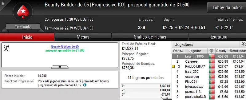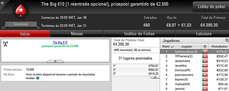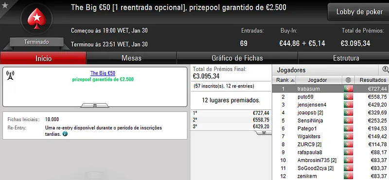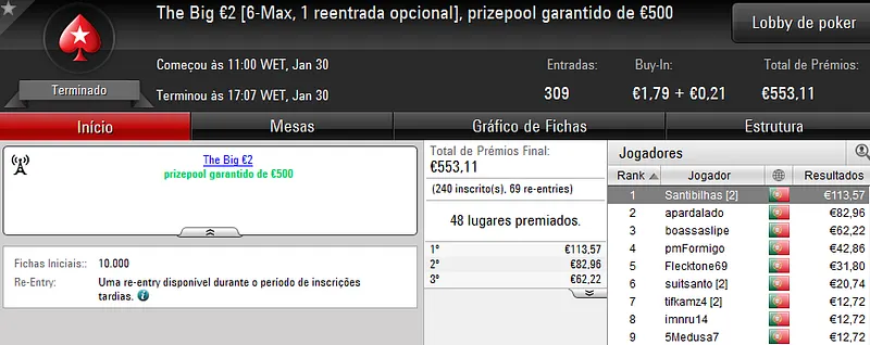 Já o The Big €100 contou com 68 jogadores, 14 reentradas e premiou 3 jogadores com valores acima dos €1,000. O maior prémio foi para "dinolamb****" que recebeu €1,746 de prémio. "bakerpt" levou €1,341 pelo segundo lugar e "famaguda01" completou o pódio com o prémio de €1,030.