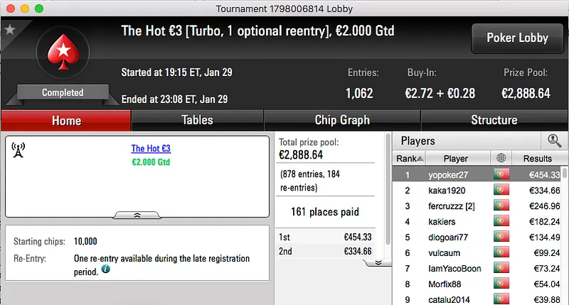 Para finalizar o pódio, o segundo maior prémio da noite ficou com Fernando "Angola_1974" Nogueira, venceu o The Hot BigStack Turbo €50 e juntou €2,189 à sua banca.