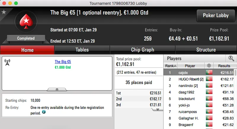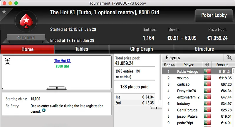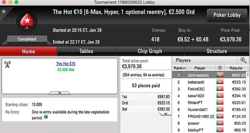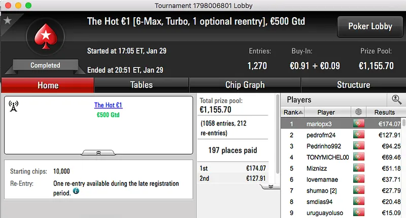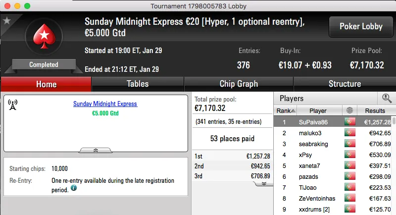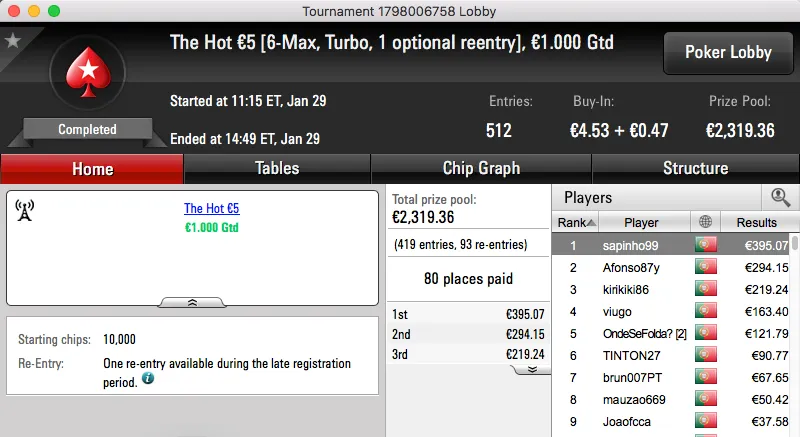 O maior prémio já entregue foi para o vencedor do Sunday Warm-UP €50, amlfaria. Sem lugar a acordo bateu pUtobs (€1,847) no heads-up e ficou com mais €2,464 na conta. O prémio de pUtobs fica com o bronze da sessão.
