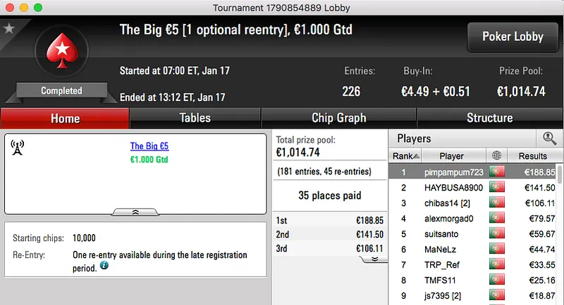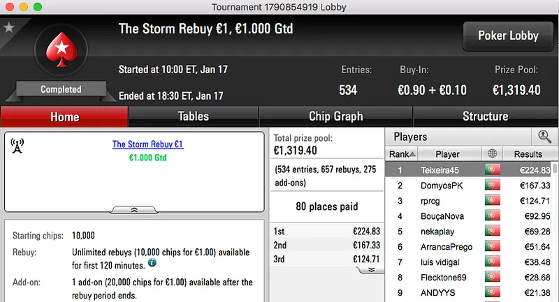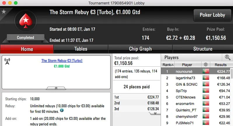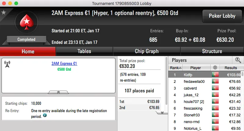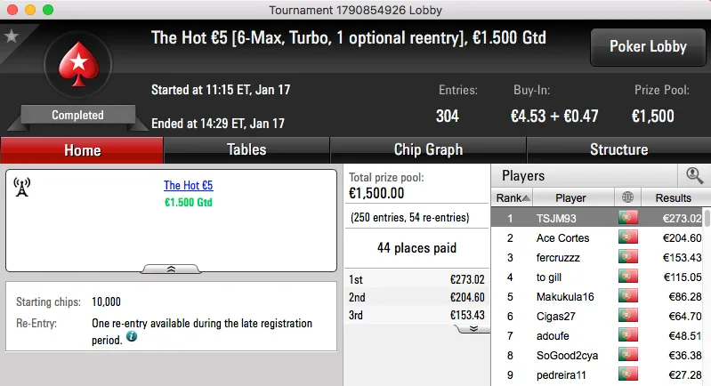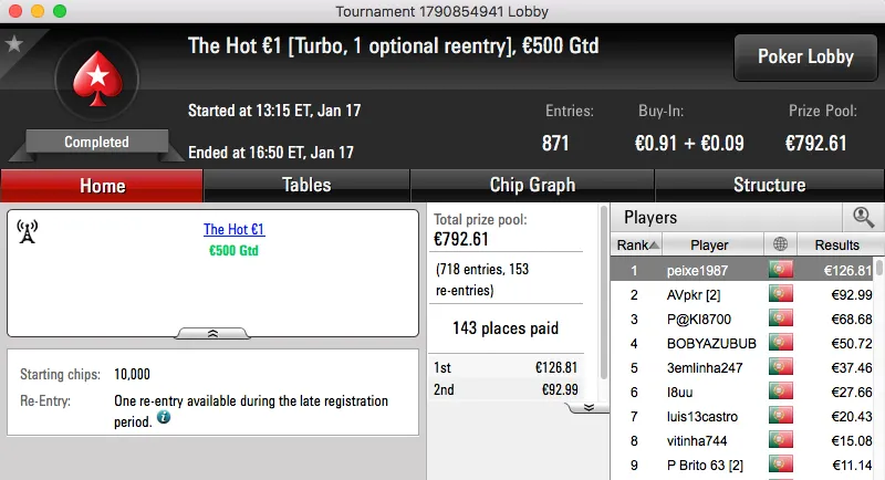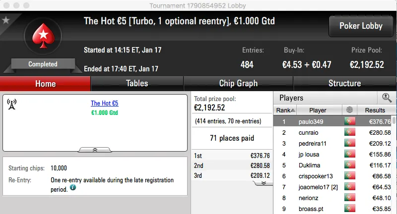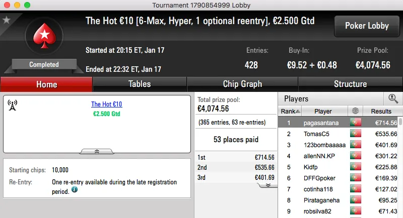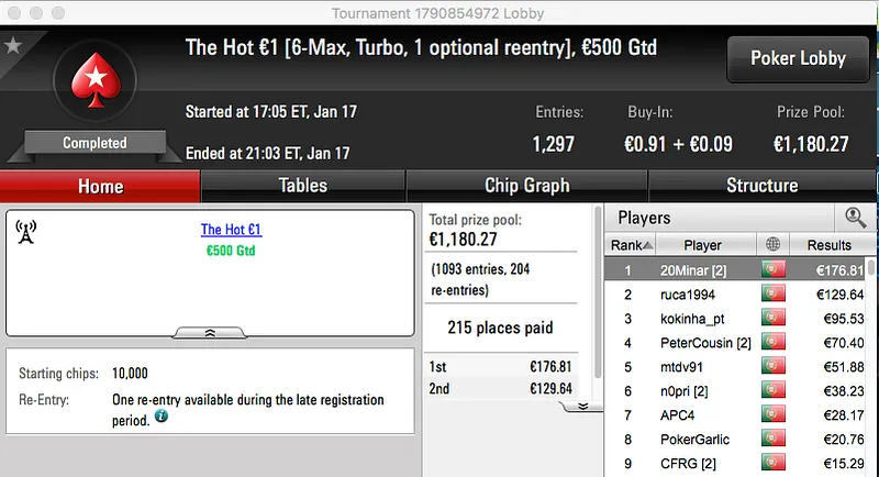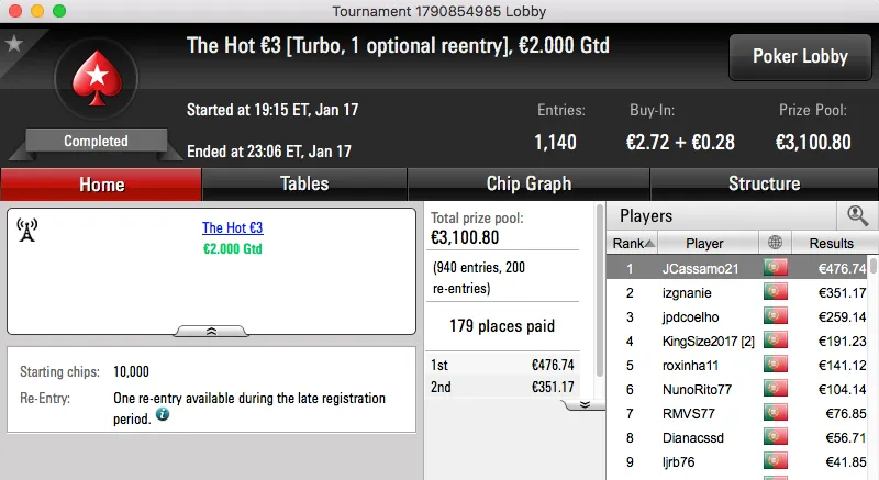 A vitória sobre Mr druqs (€1,885) garantiu-lhe um aumento de banca de €2,473, estes foram o 1º e 3º maiores prémios entregues ontem.