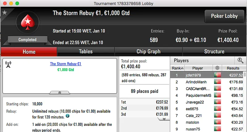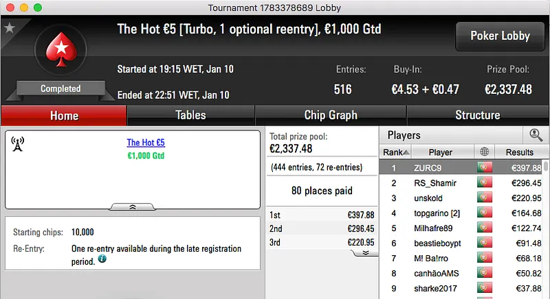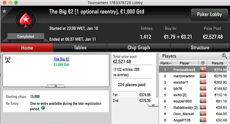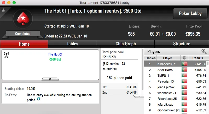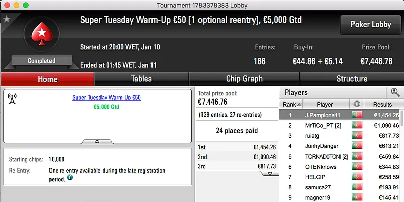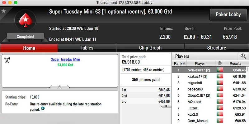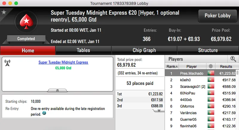 O maior prémio da noite foi para Loures e ficou na conta de hugofmartins, €2,707. Esta vitória surgiu depois de bater Garrido509 (€2,039) no heads-up do Super Tuesday €100 . Estes foram o 1º e 3º maiores prémios da sessão.