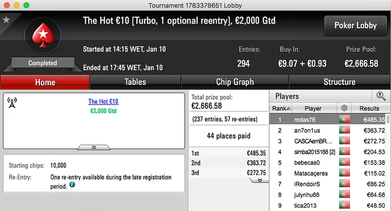 O lugar do pódio que falta preencher fica na posse do jogador de Recardães, iWasDjWtf. Venceu o The Hot BigStack Turbo e juntou €2,053 à sua banca.