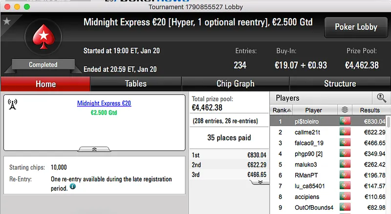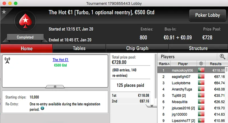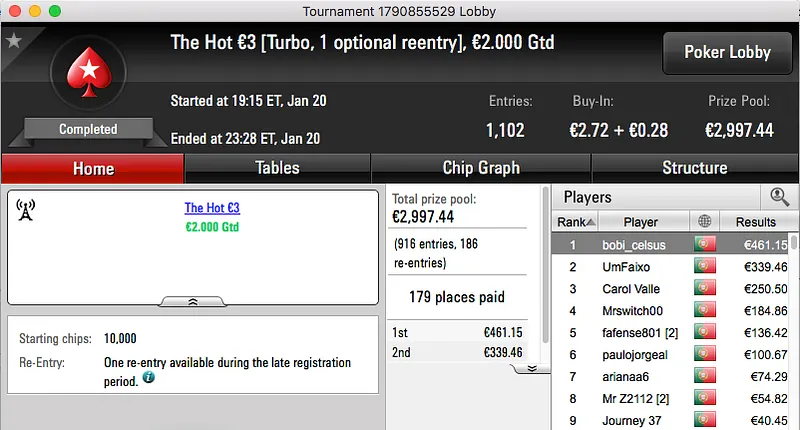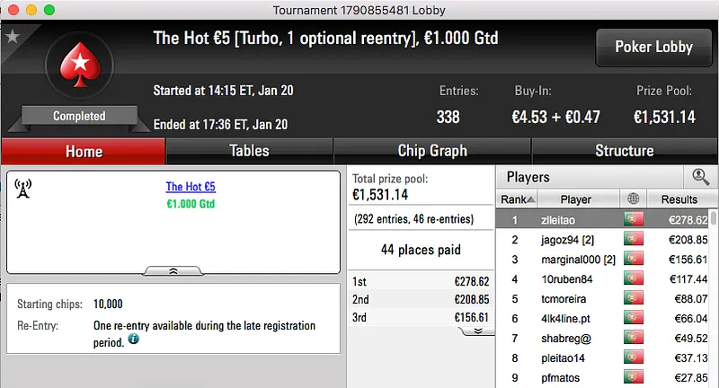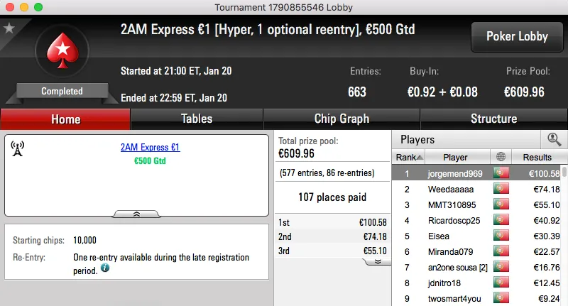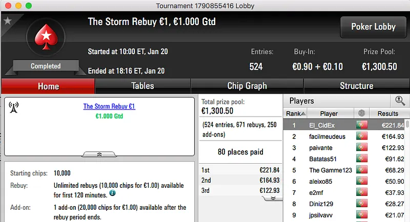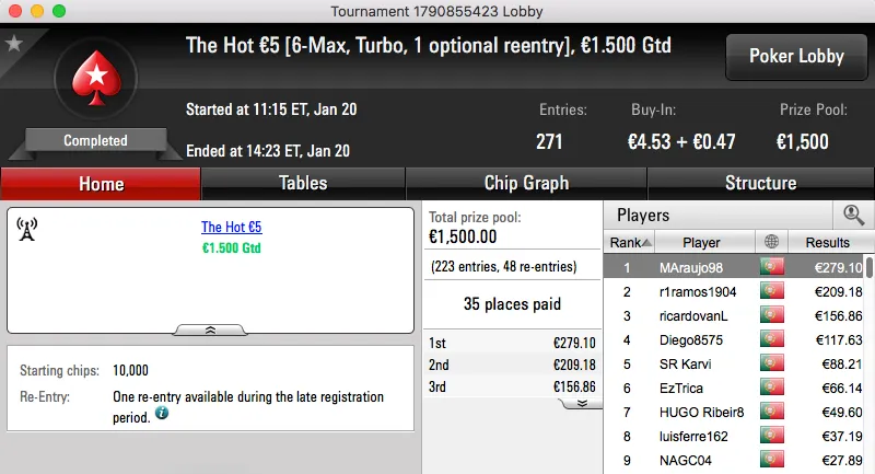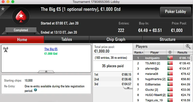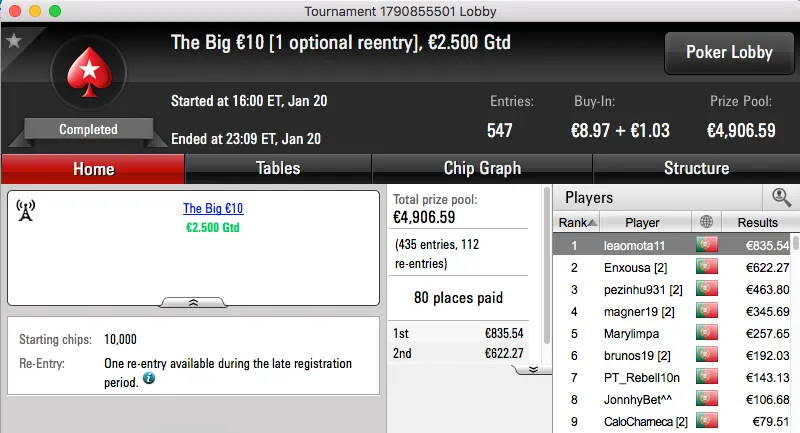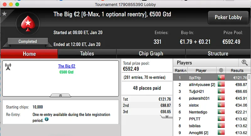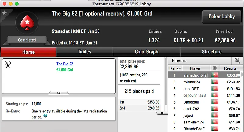 Ao contrário do que se tem passado, o pódio perfaz-se com os dois primeiros classificados do The Big €100. A vitória ficou para no_fearrrr (€1,406), que derrotou drOppzPT (€1,080) em heads-up.