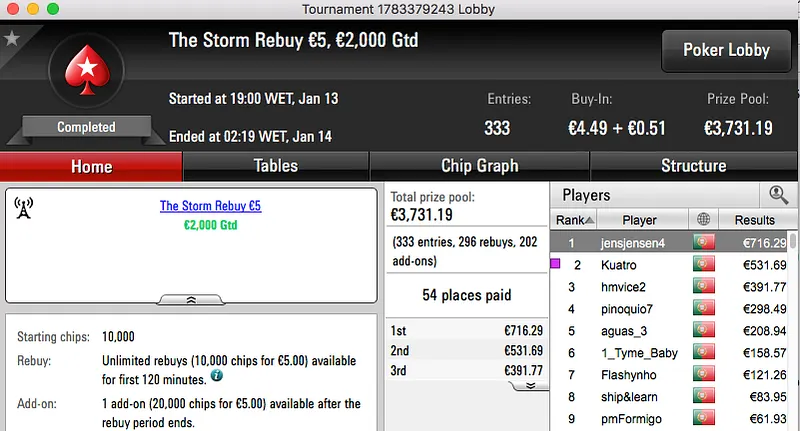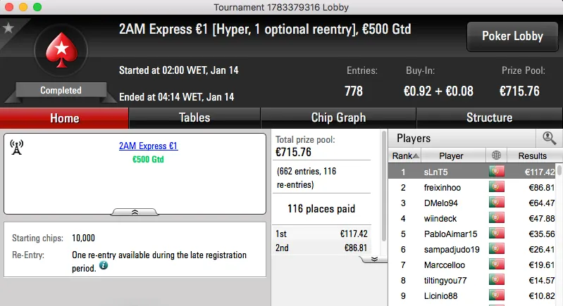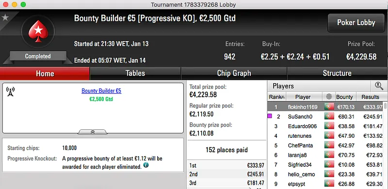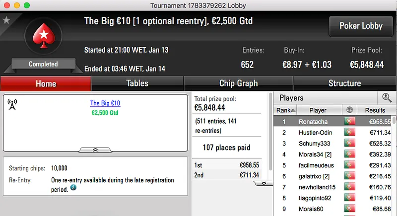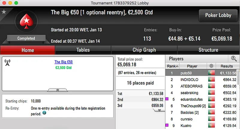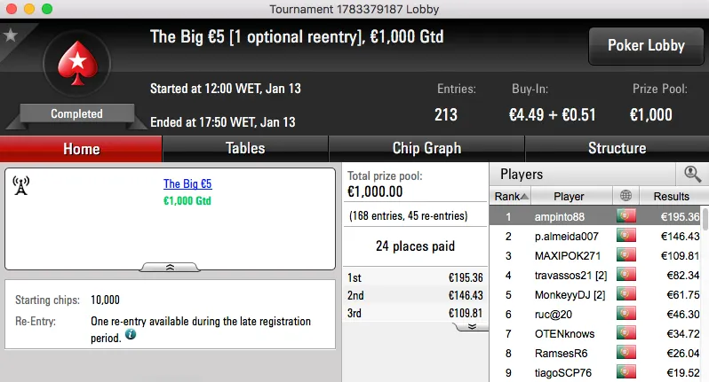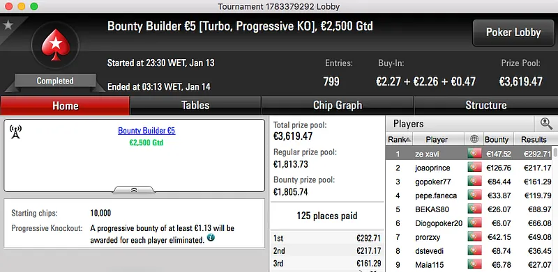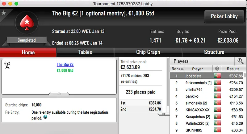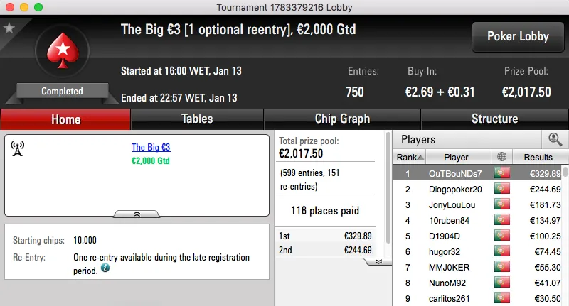 A vitória sobre SpiTrip (€1,554) no heads-up do The Big €100 rendeu €2,023. Estes foram, mais uma vez, o 1º e 3º maiores prémios da sessão.