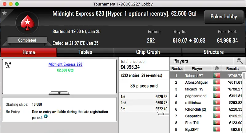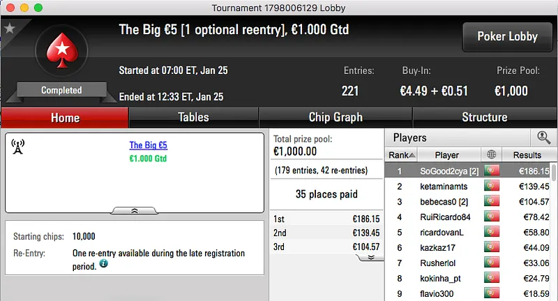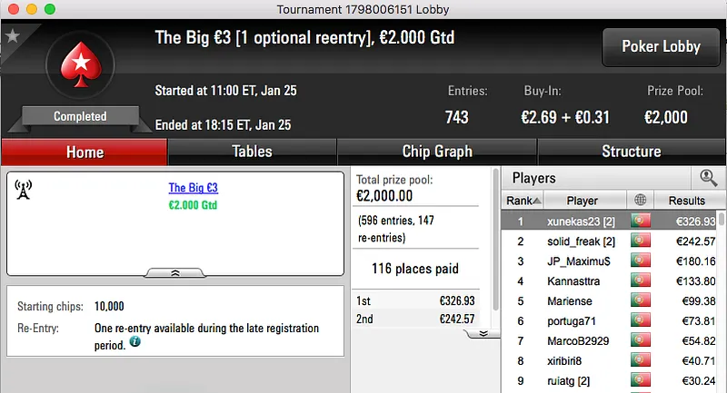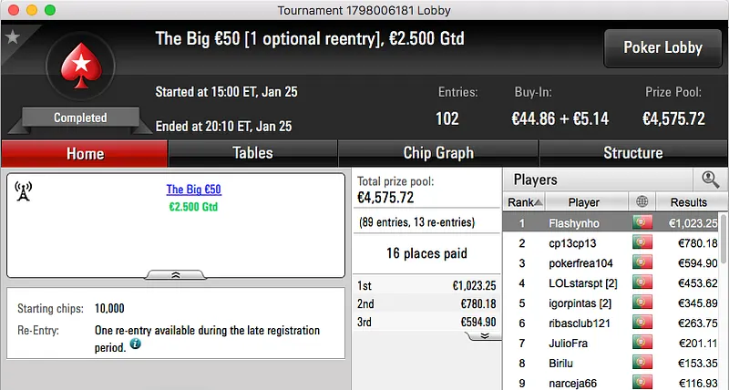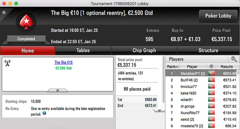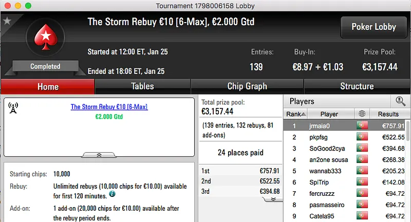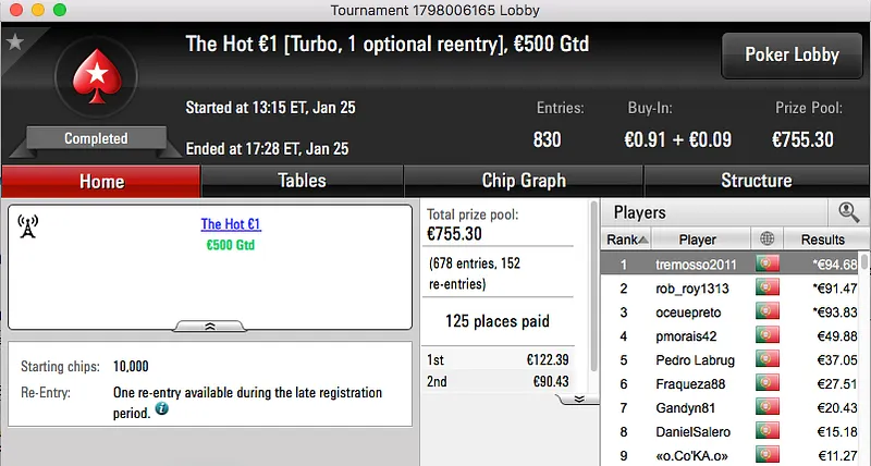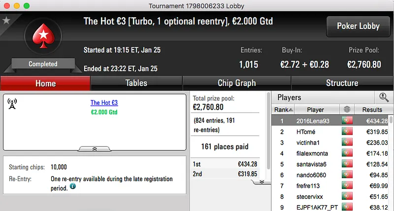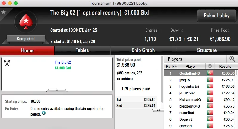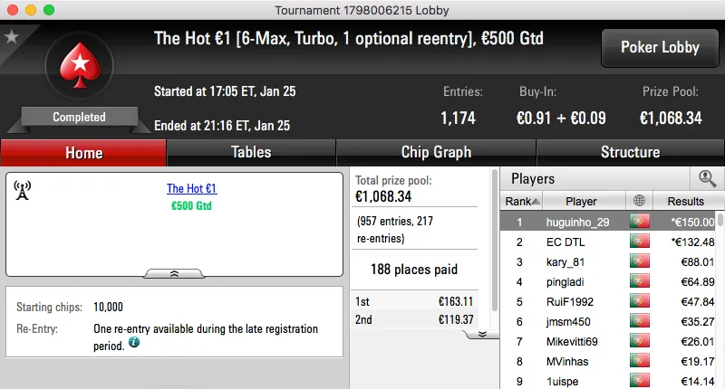 O prémio que falta para preencher o pódio foi a bapm1980 pela vitória no Hot BigStack Turbo €50, €1,403.