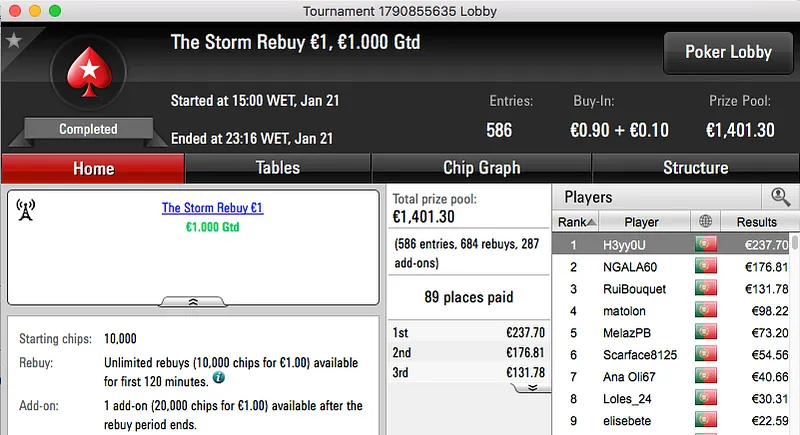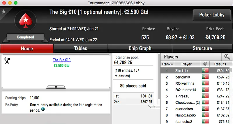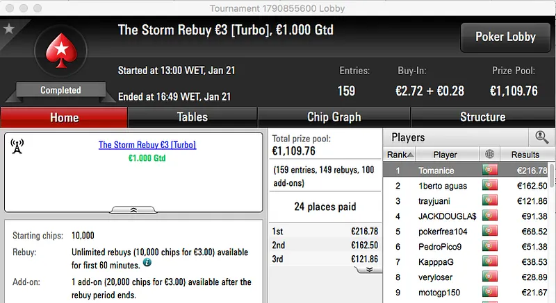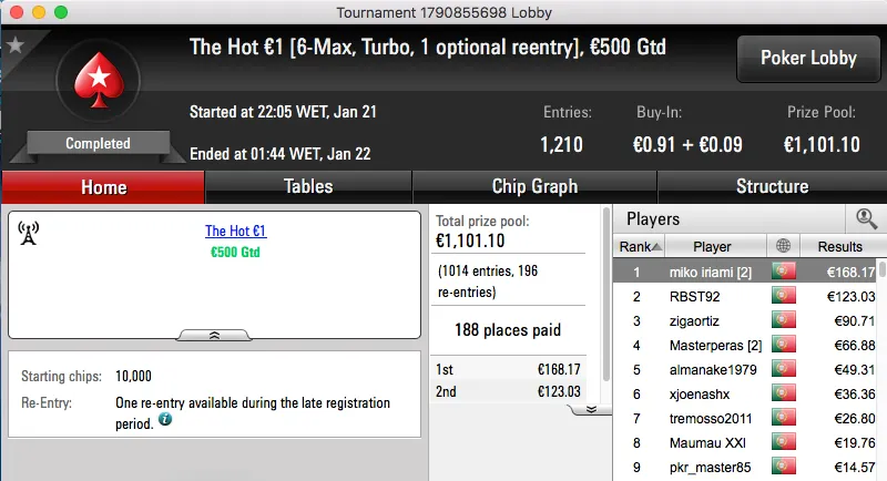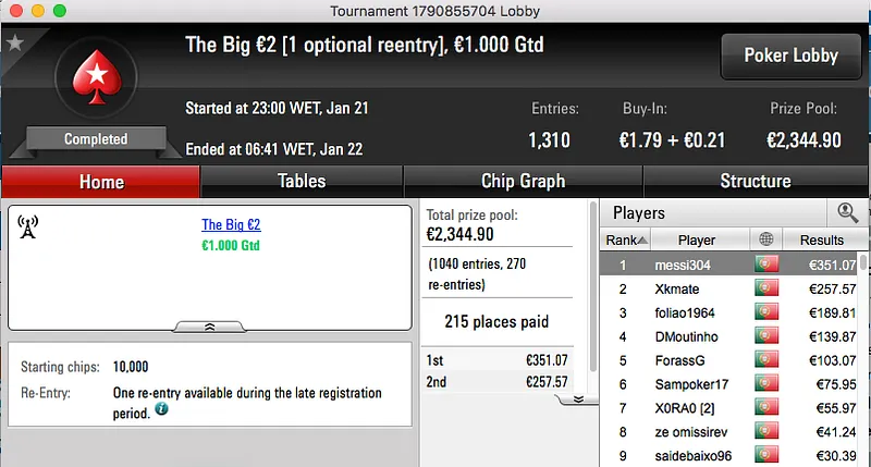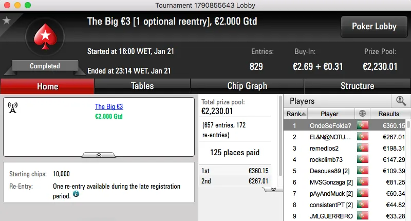 A sessão de sábado da PokerStars.pt terminou com blac2424 a vencer o The Big €100 e a ficar com o maior prémio do dia, €1,491. A vitória chegou depois de bater assapalo1 (€1,145) em heads-up, estes foram o 1º e 3º maiores prémios entregues no dia.