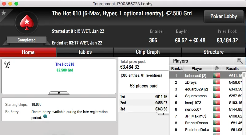 A prata do dia ficou para o vencedor do The Hot BigStack Turbo €50, blueye8. A vitória sobre o lacobrigense Variâncias (€1,005) rendeu €1,457.