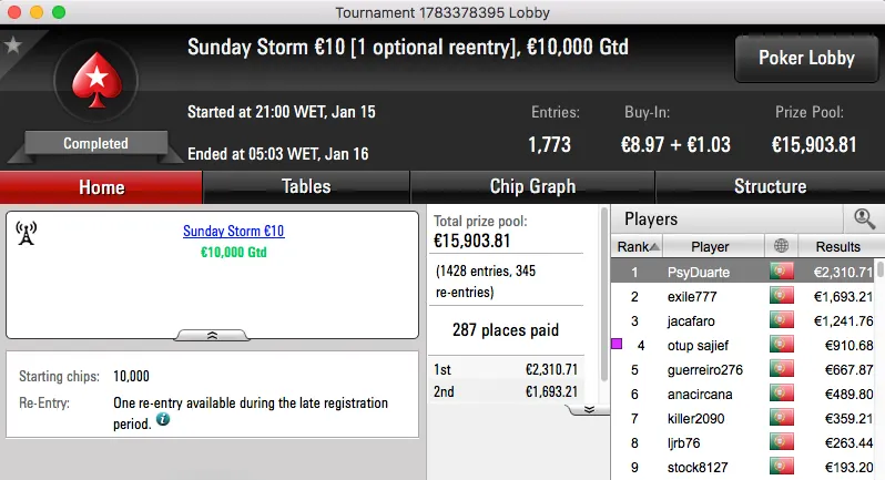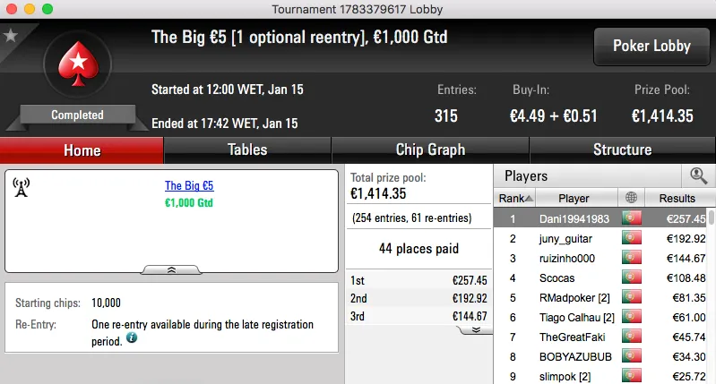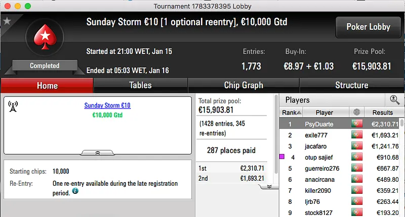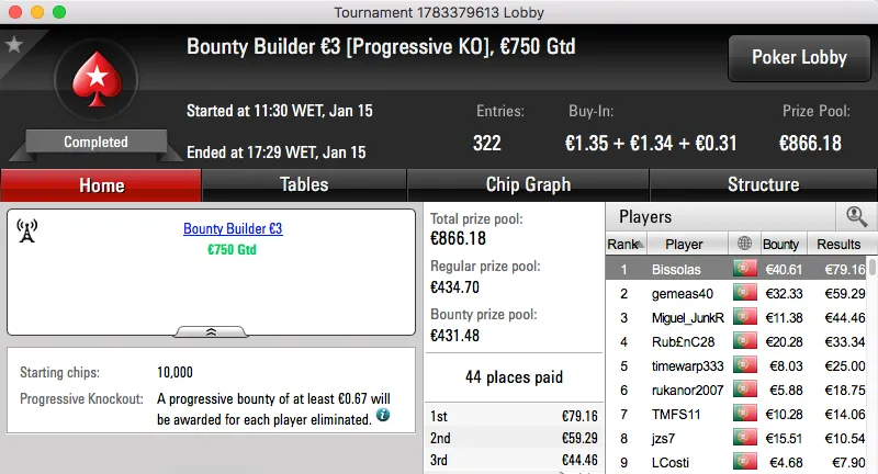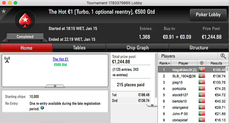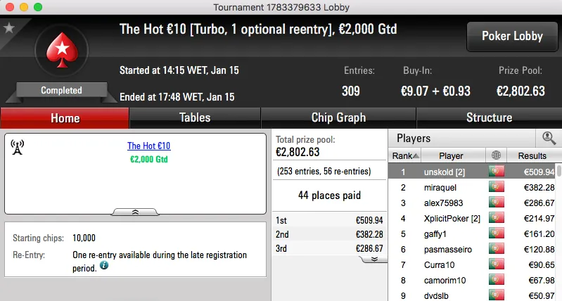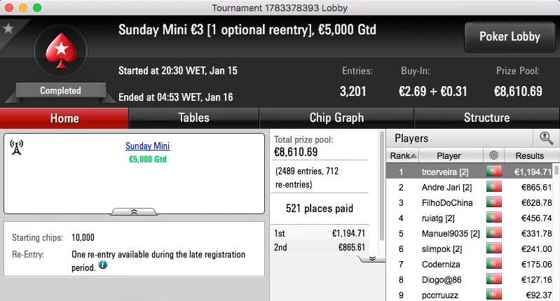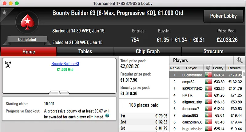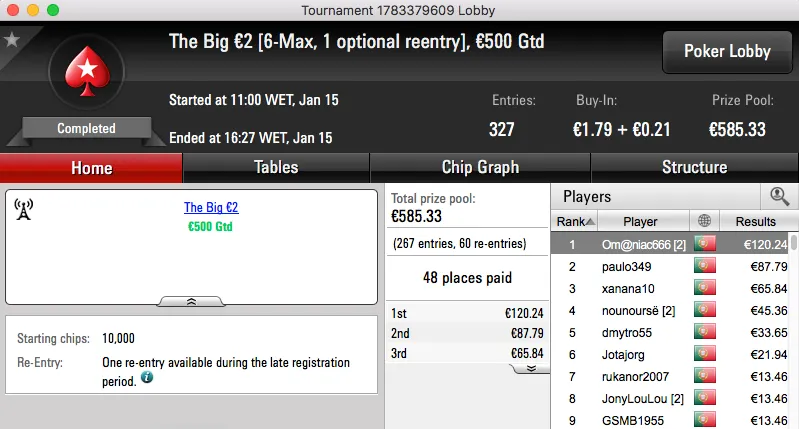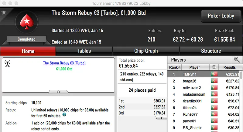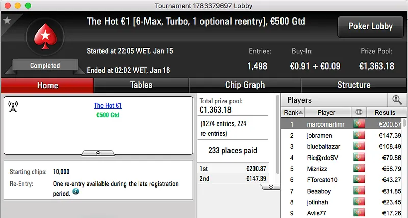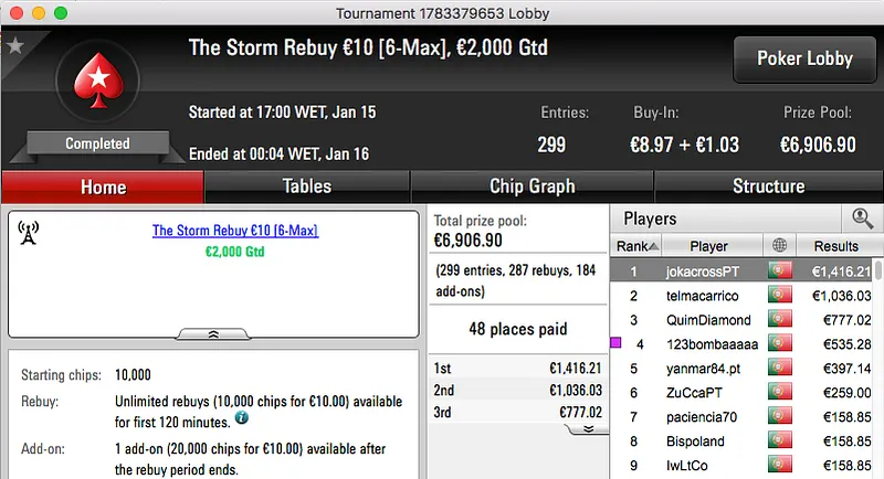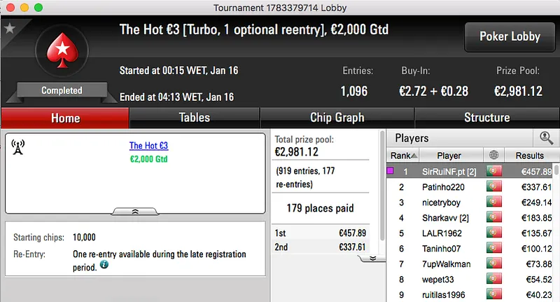 Ao levar a melhor sobre shinekorakki (€2,761) no heads-up garantiu um prémio de €3,682, estes foram os dois maiores prémios da sessão.