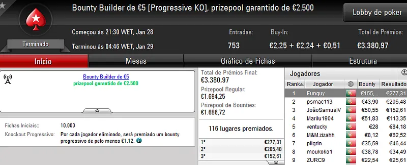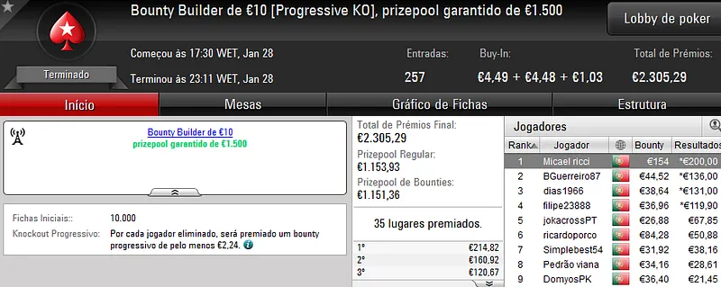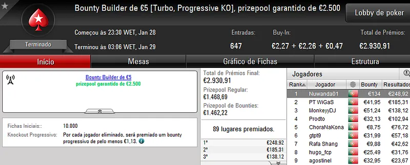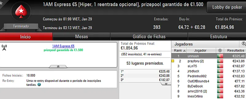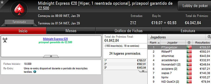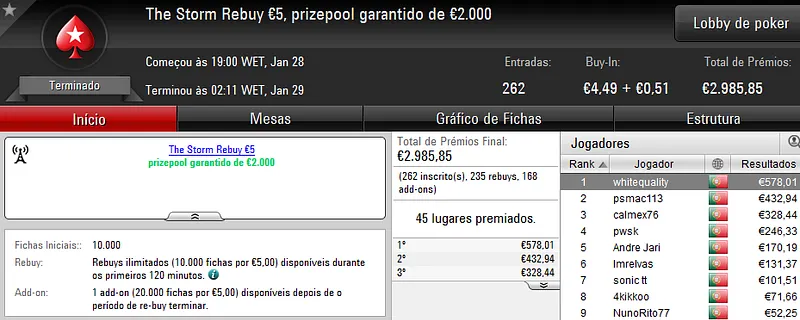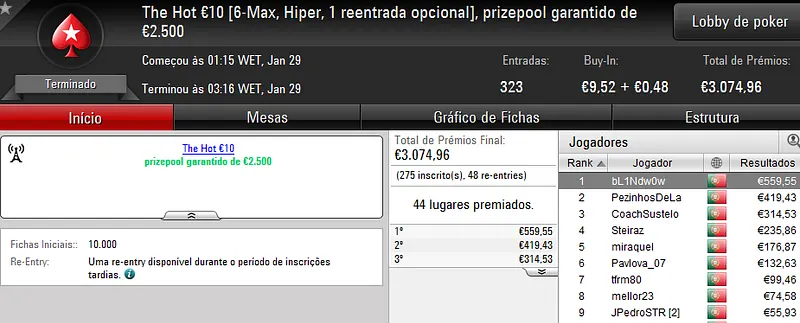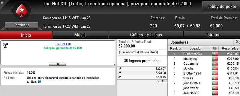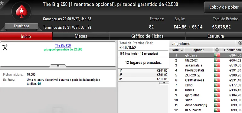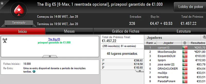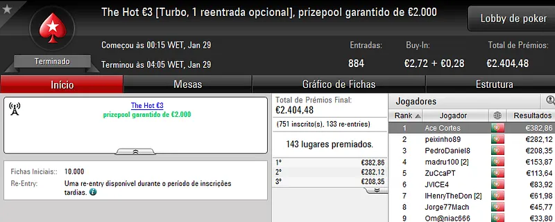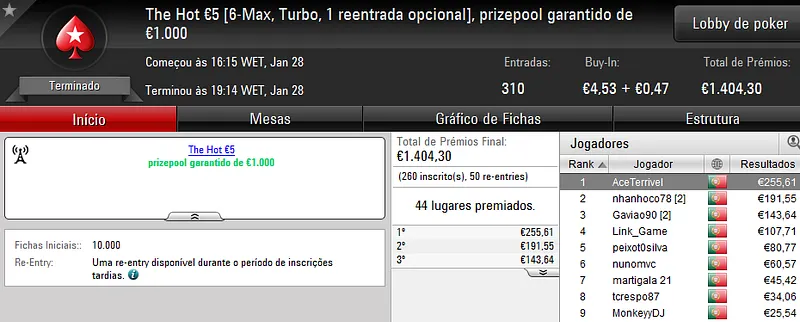 O maior prémio foi atribuído no The Hot BigStack €50 com 105 jogadores e 21 reentradas. O campeão, “sirjoaocastr”, levou para a sua conta €1,485 depois de vencer “dr.gongs” no heads up (€999).
