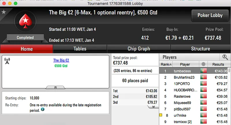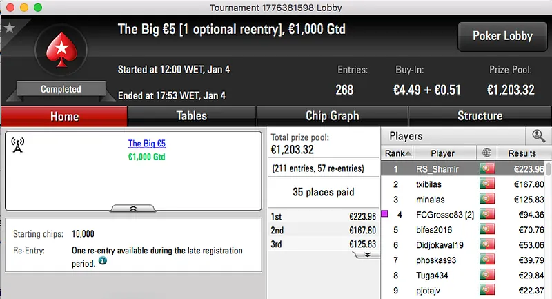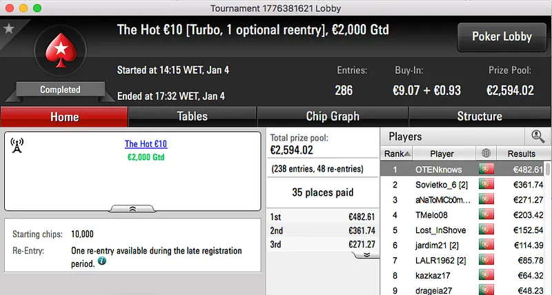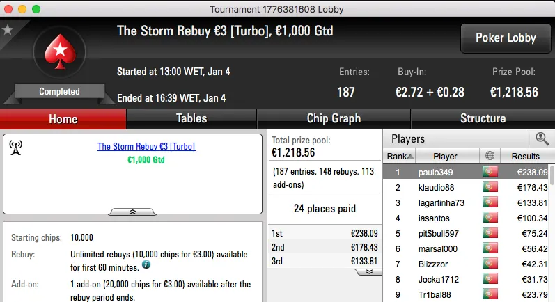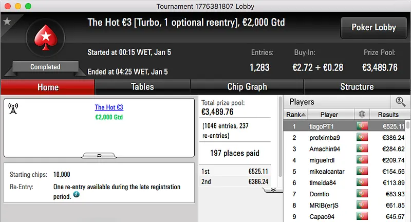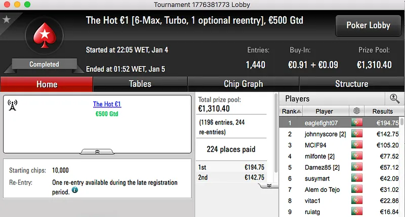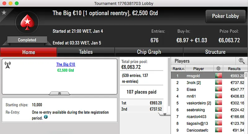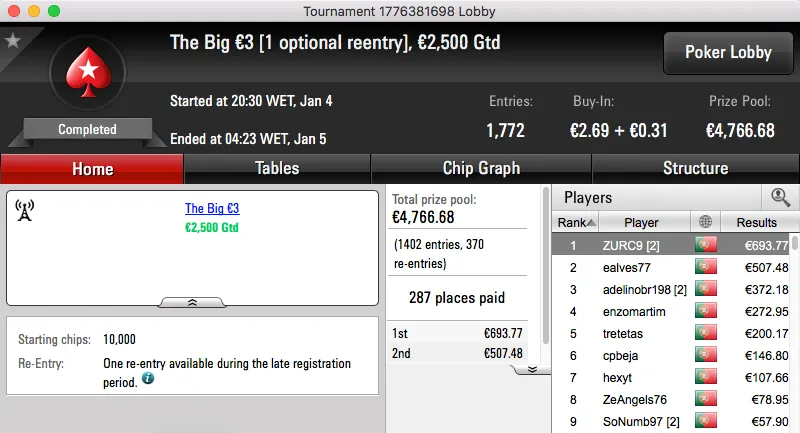 A sessão de quarta-feira da PokerStars.pt terminou com vários jogadores a faturar prémios de 4 dígitos. O maior foi mais uma vez o vencedor do The Big €100, SuSanch0 bateu Pitas_90 (€1,587) em heads-up e recebeu €2,066.