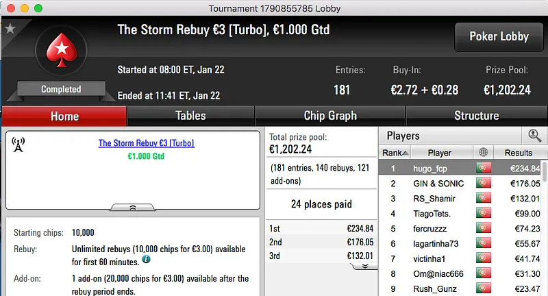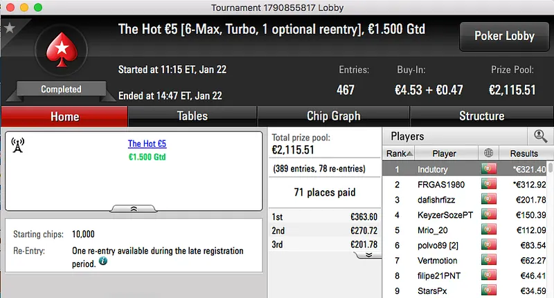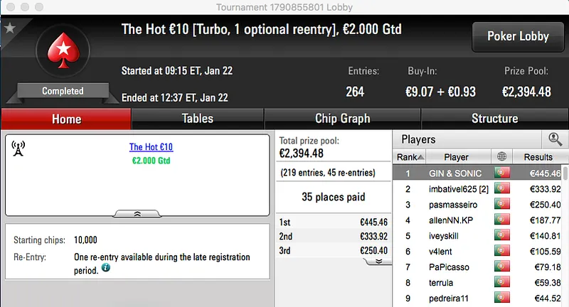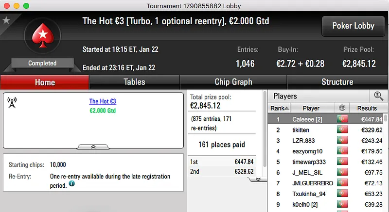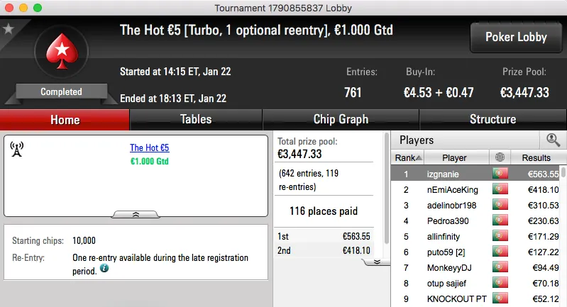 O segundo maior prémio da sessão foi a vitória de Kid Quack no Sunday Warm-Up €50, o jogador do Barreiro juntou €2,564 à sua banca.
