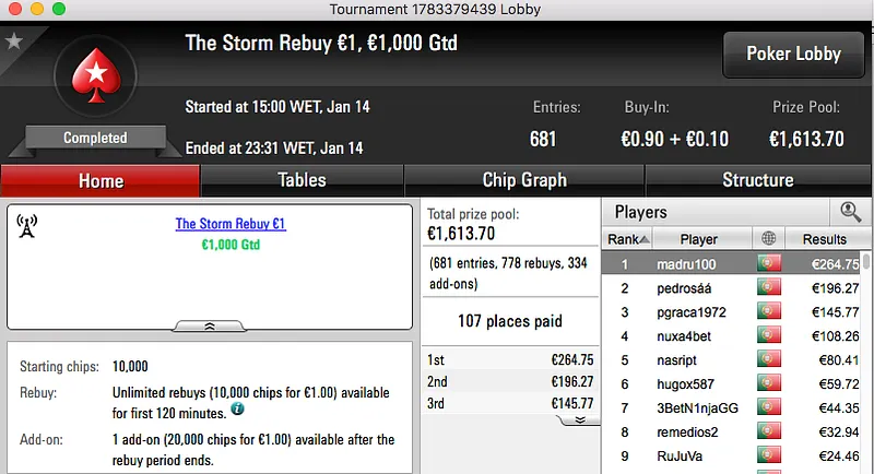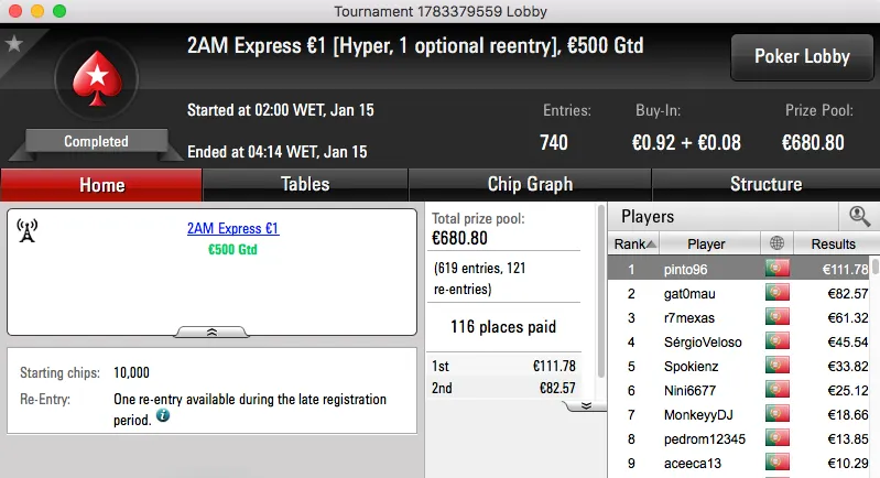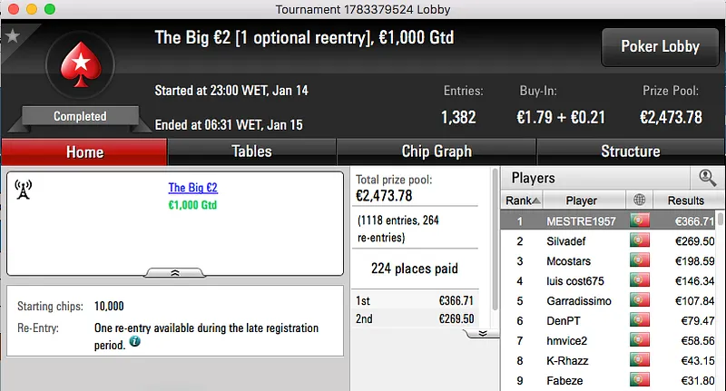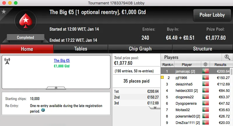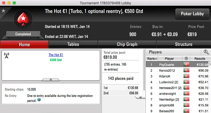 O segundo maior prémio da sessão também ficou no norte do país. O vizelense nunorebelo22 bateu JDRBaptista (€1,027) no heads-up do The Hot BigStack Turbo €50 e tem agora mais €1,490 na sua conta da PokerStars.pt.