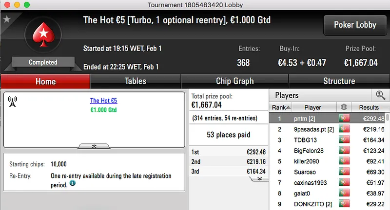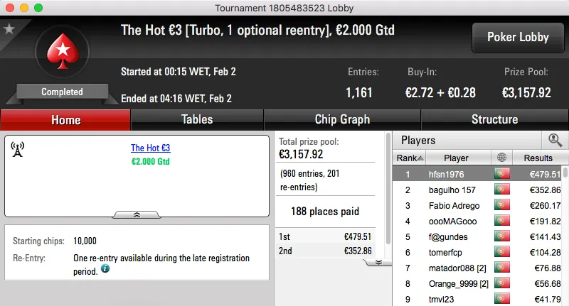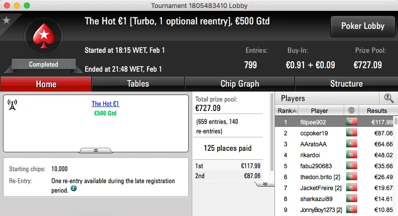 A vitória sobre jresendep (€1,185) no heads-up do The Hot BigStack Turbo €50 rendeu €1,719, o maior prémio da noite.