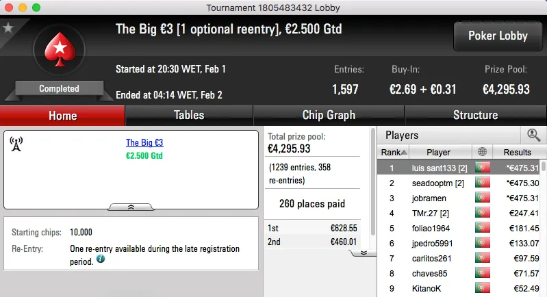 O restante pódio fica ocupado pelos jogadores que disputaram o heads-up do The Big €100. João "JuJonas" Gonçalves bateu TMelo08 (€1,276) no heads-up e juntou mais €1,661 à sua banca.