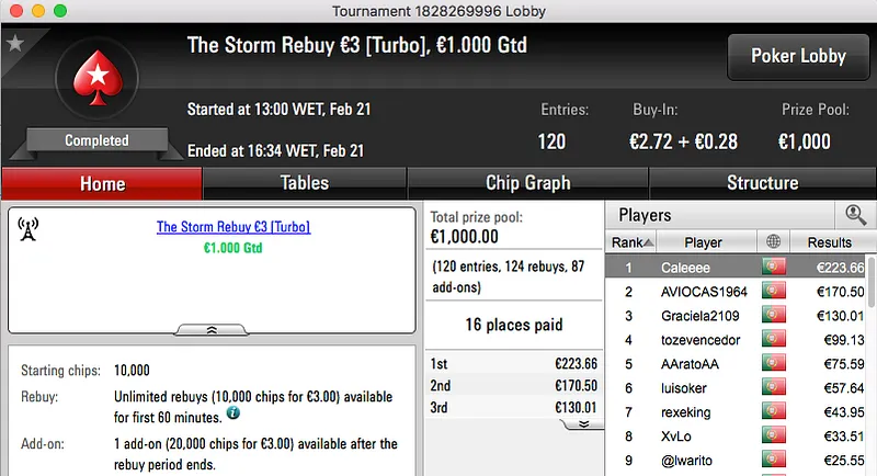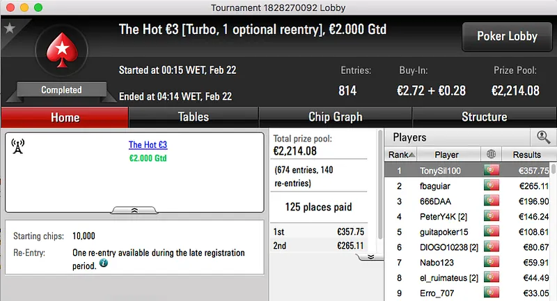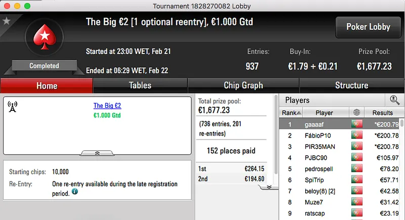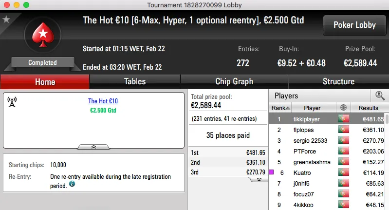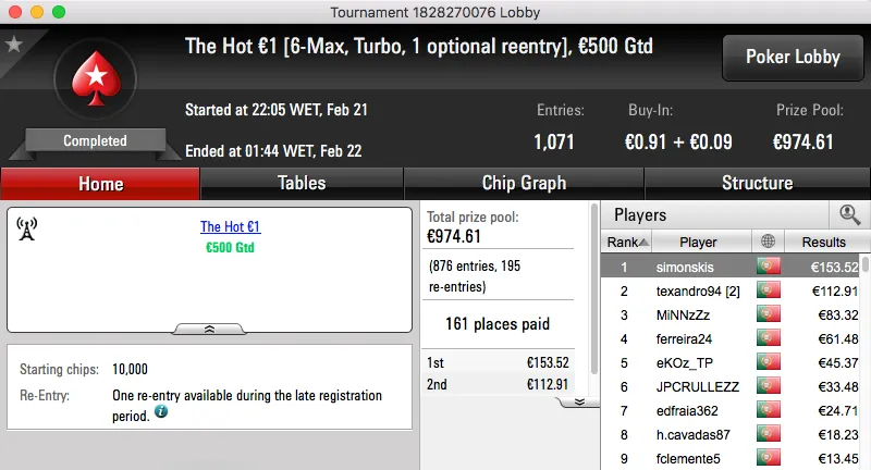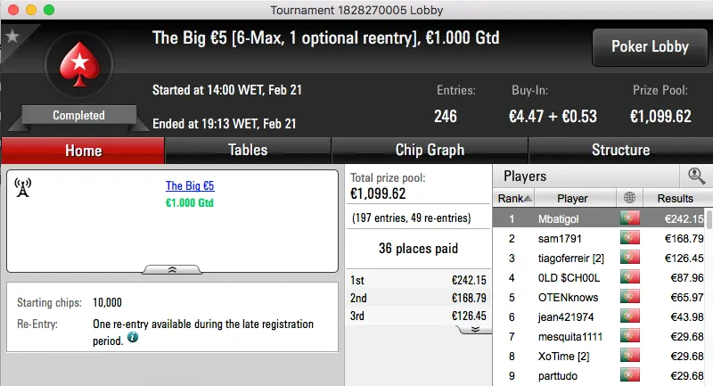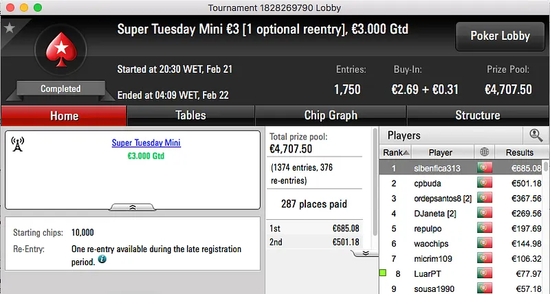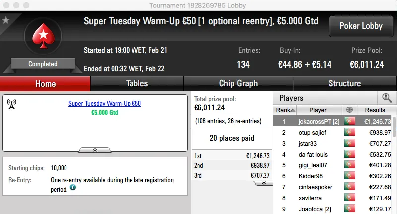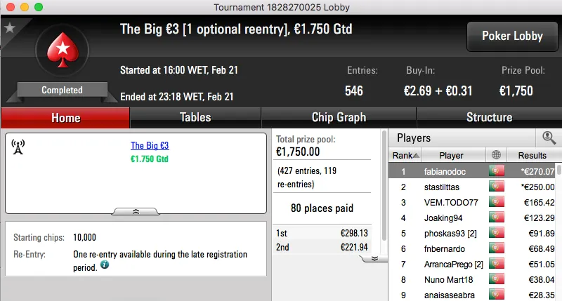 Por último temos a vitória de Tiago Ferreira no Super Tuesday Big €10, tem mais €1,277 na sua conta.
