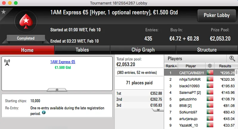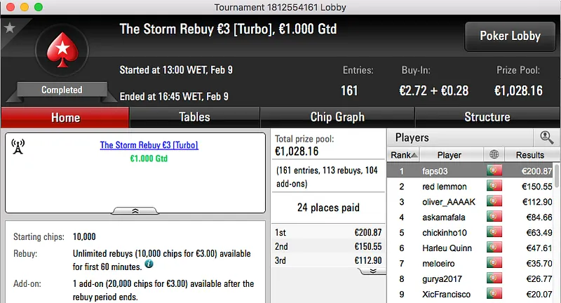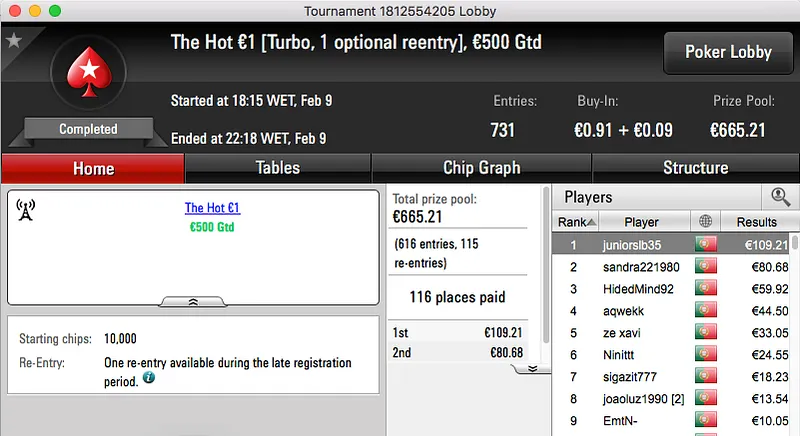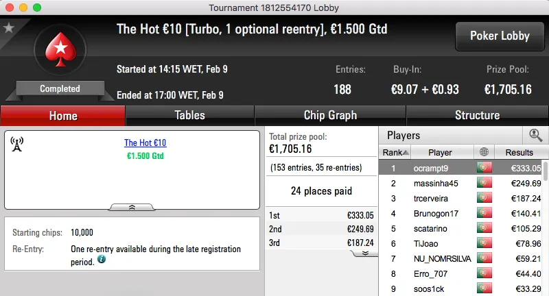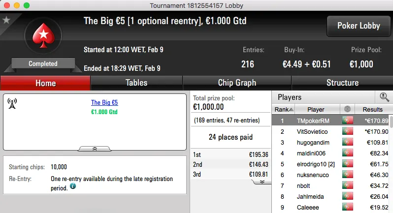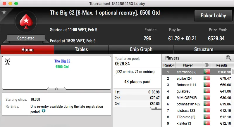 O pódio da mesma encerra com a vitória de buxytaa no The Big €20, recebeu €1,097.