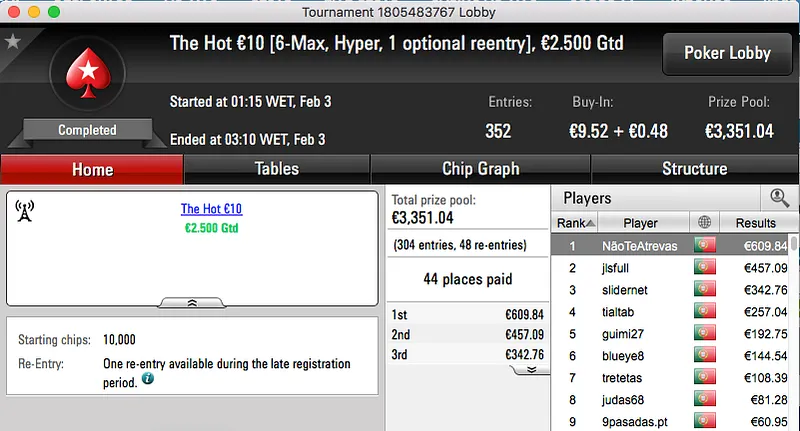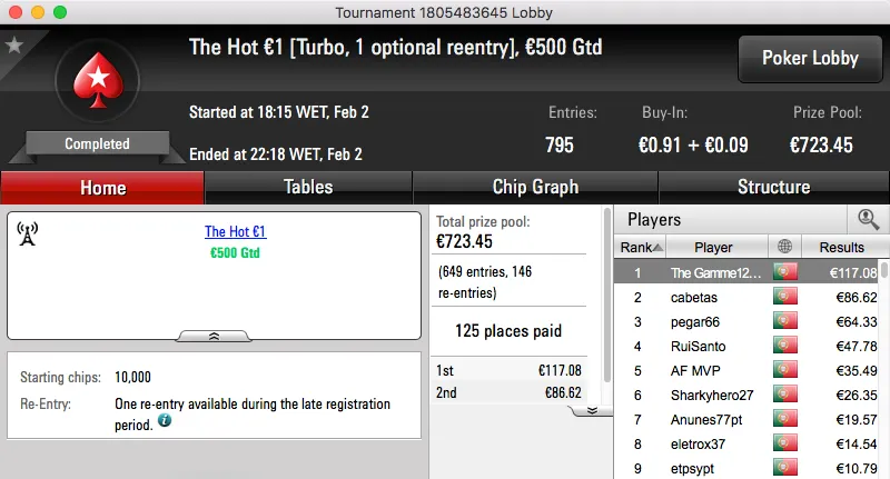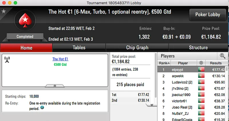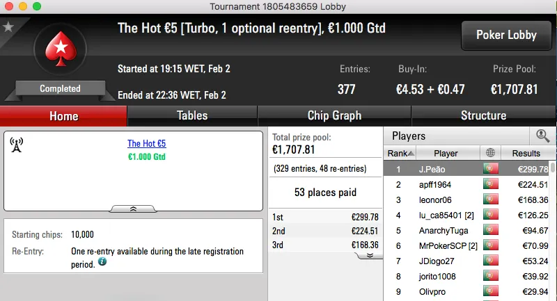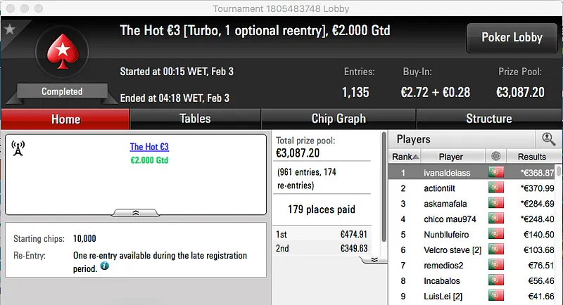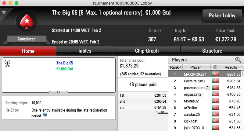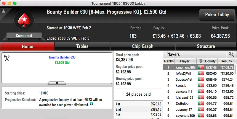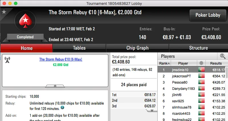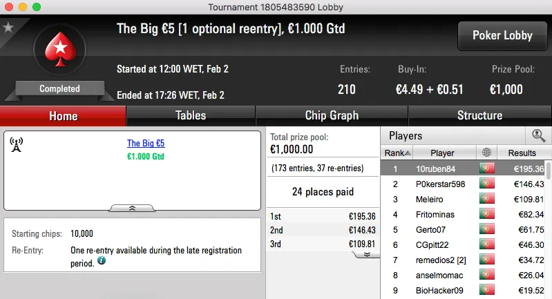 Logo atrás ficou jgrhajsj, bateu fmbdrink (€1,129) no heads-up do The Big €100 e recebeu €1,469. Estes dois prémios perfazem o pódio da sessão.