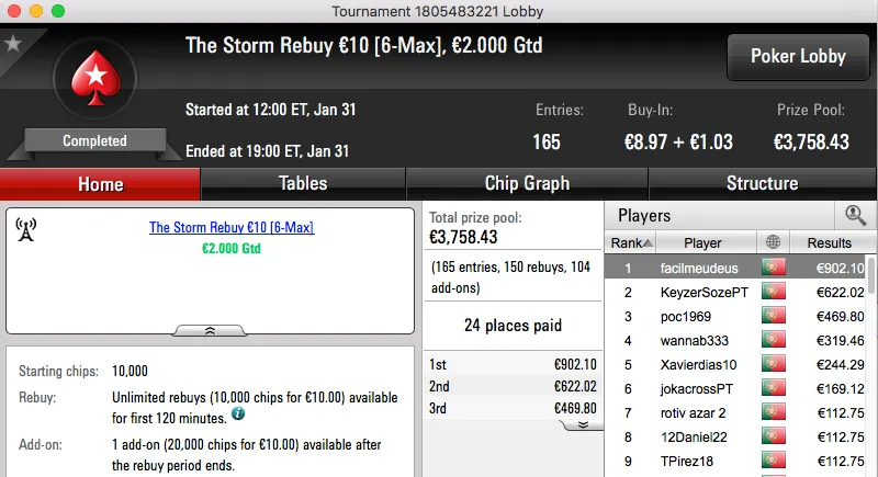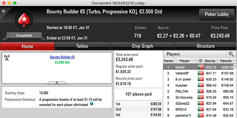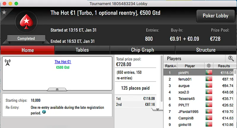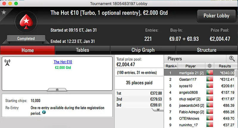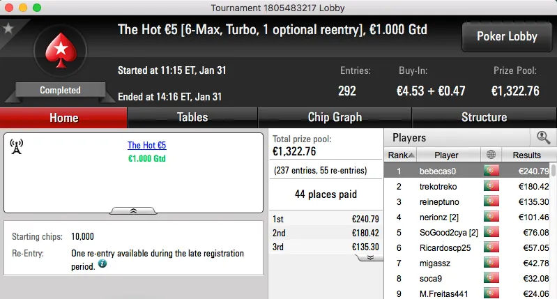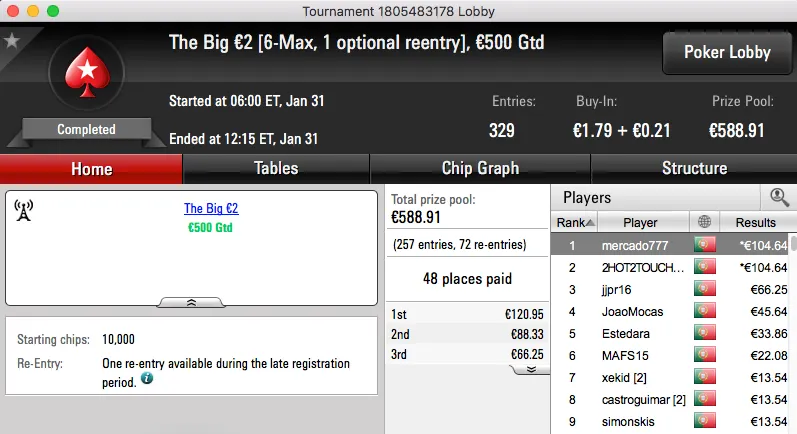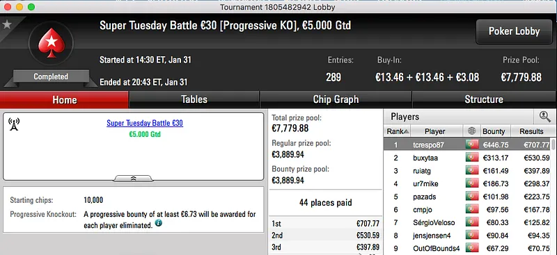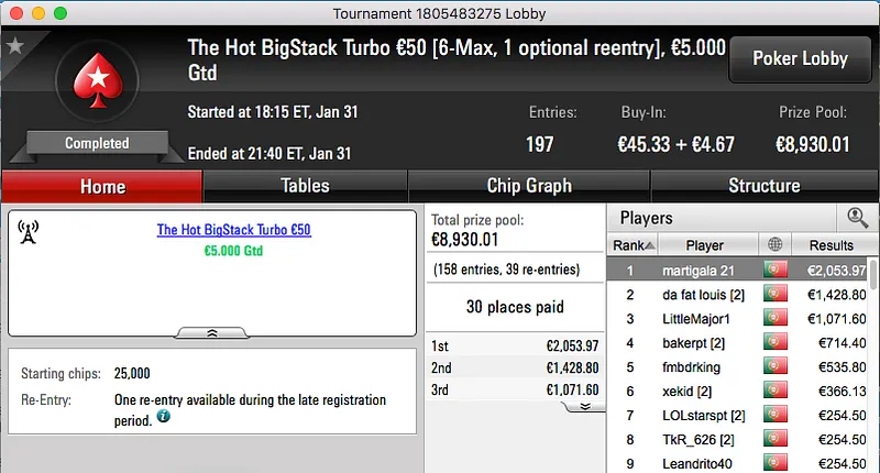 ferpin22 Vence Super Tuesday €100; martigala 21 o The Hot BigStack Turbo €50 & Mais
