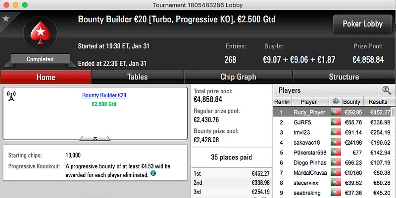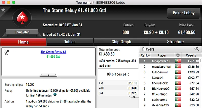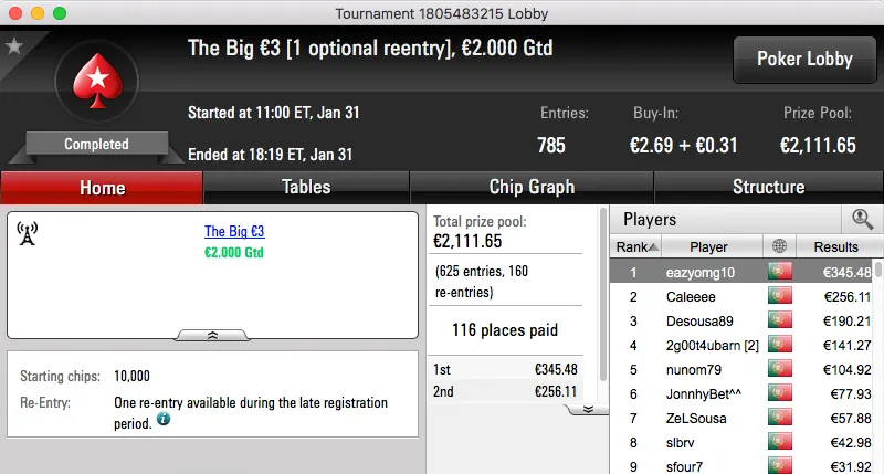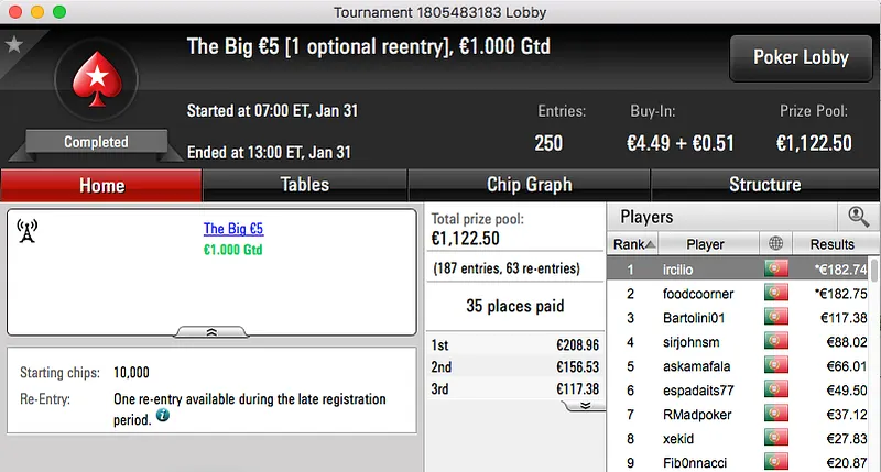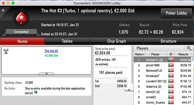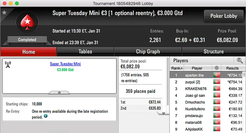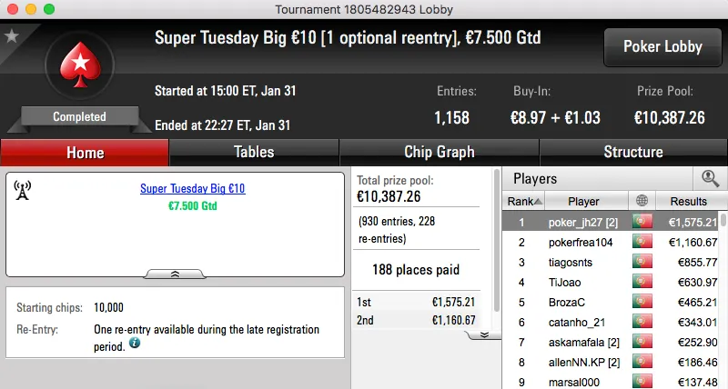 A sessão de terça-feira da PokerStars.pt terminou com ferpin22 a ganhar o prémio, €2,631, fruto da vitória no Super Tuesday €100. A vitória foi alcançada depois de bater Yazald€_10 (€1,982) no heads-up, estes foram o 1º e 3º maiores prémios da sessão.