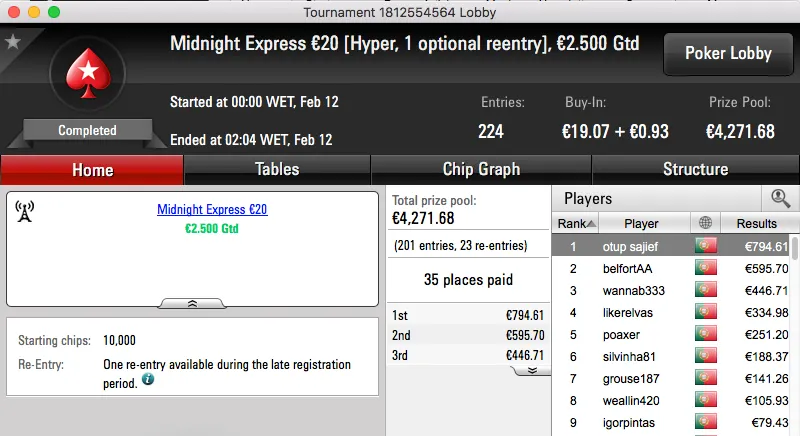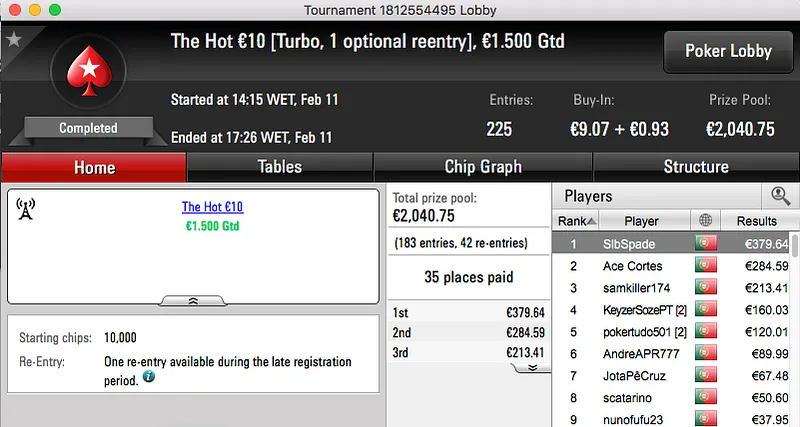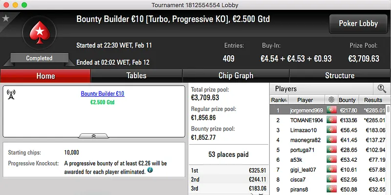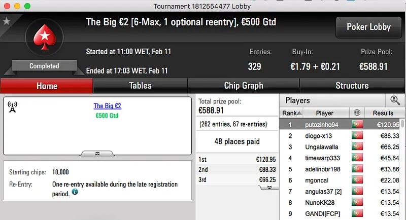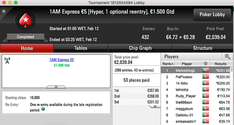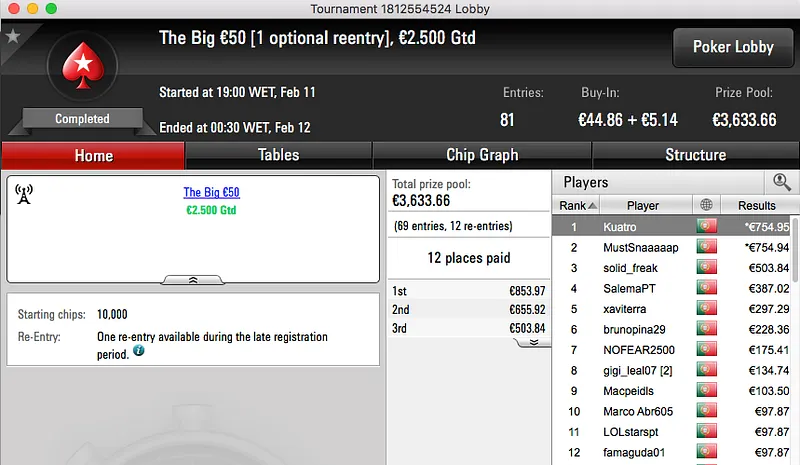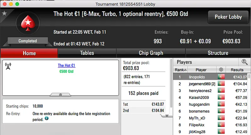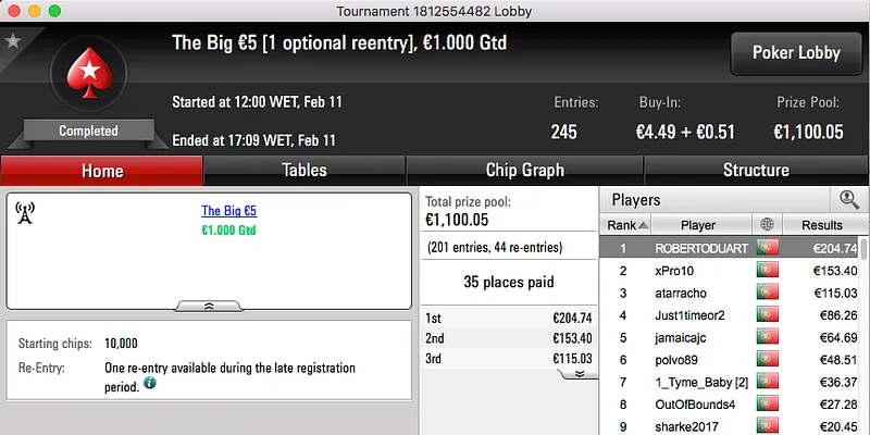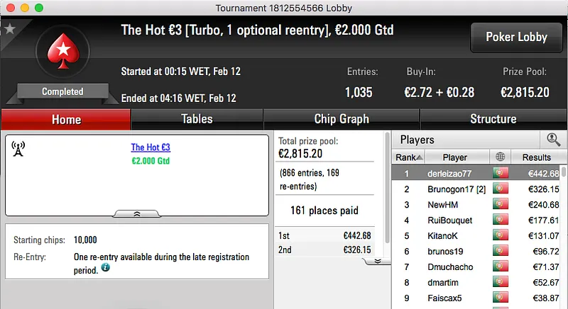O pódio fecha com a vitória de RSantos98 no The Big €20, recebeu €1,005.