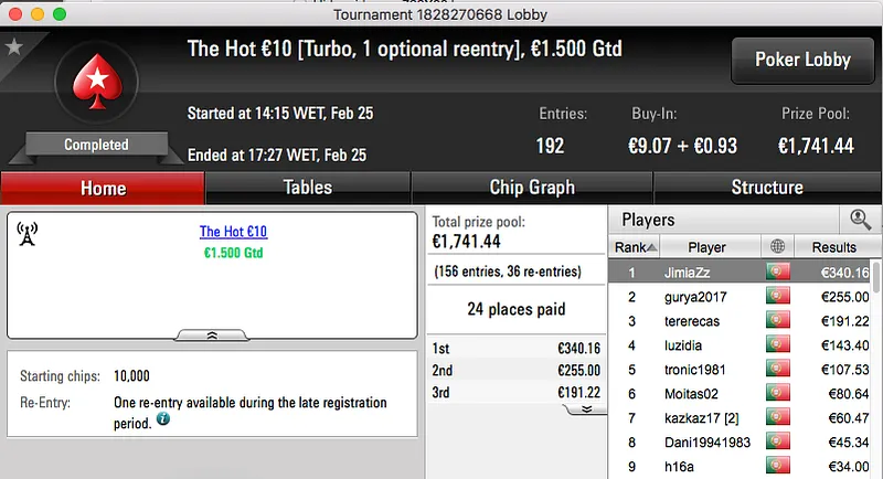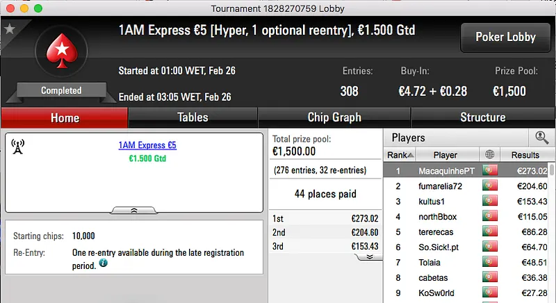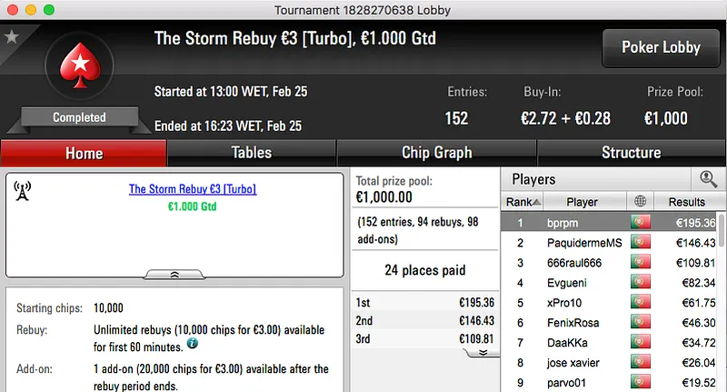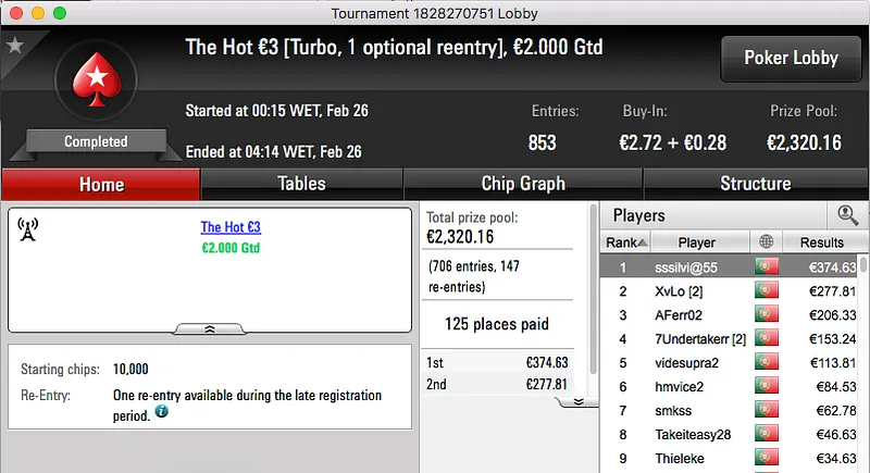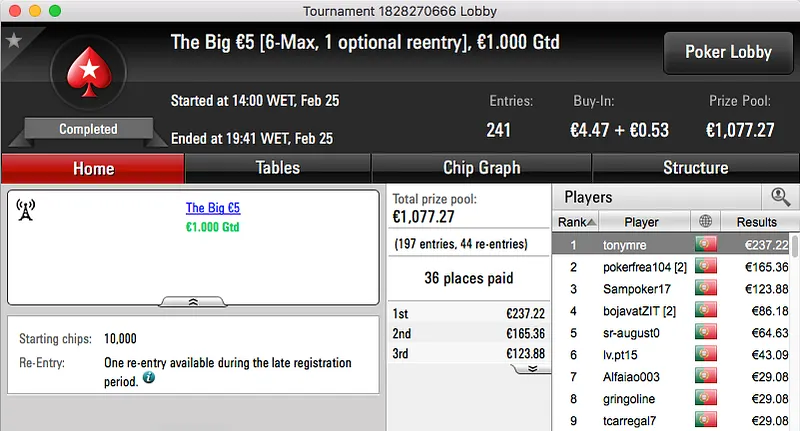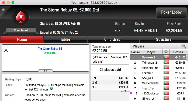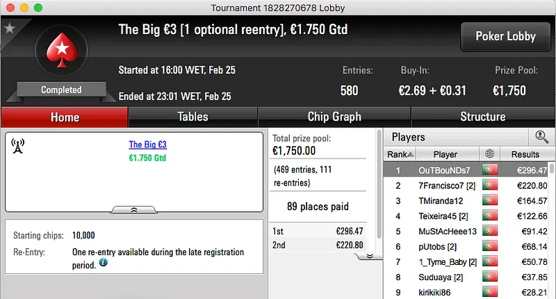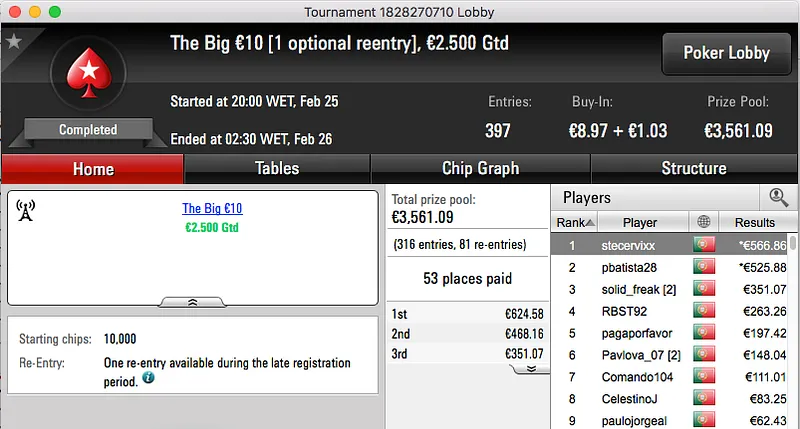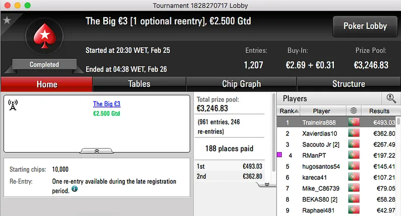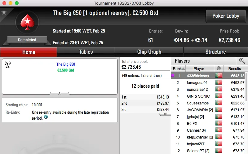 O Carnaval fez com que as mesas estivessem algo despidas na sessão de sábado e os maiores prémios foram entregues no The Big €100, jgrhajsj e raisemuck88 fizeram acordo heads-up e cada um recebeu 1,250 "máscaras".