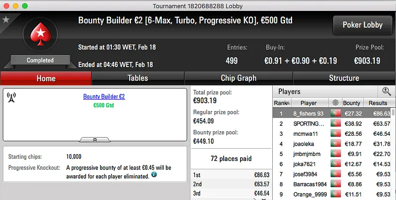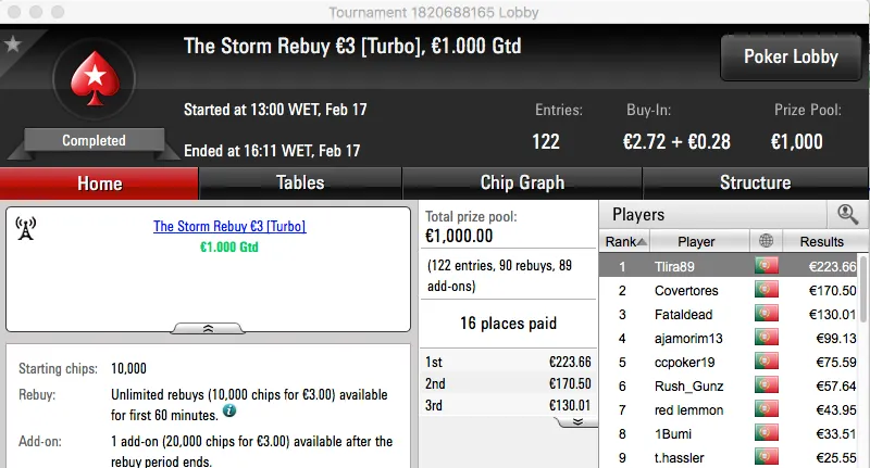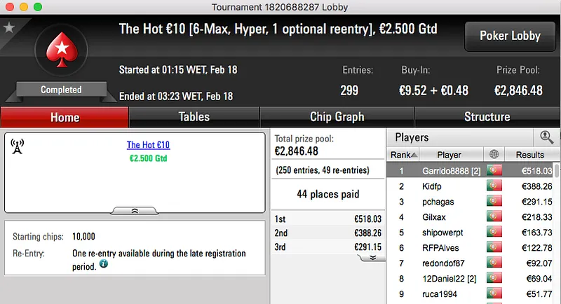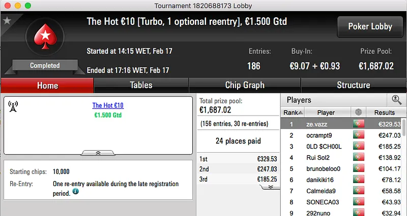 Rui Bouquet tem sido presença habitual nas mesas finais do torneios da PokerStars.pt e esta sexta-feira acabou por ser o melhor no The Hot BigStack Turbo €50. Sem lugar a qualquer tipo de acordo Rui ficou com os €1.599 reservados ao vencedor, o heads-up foi jogado contra Amilcar232 (€1,102).