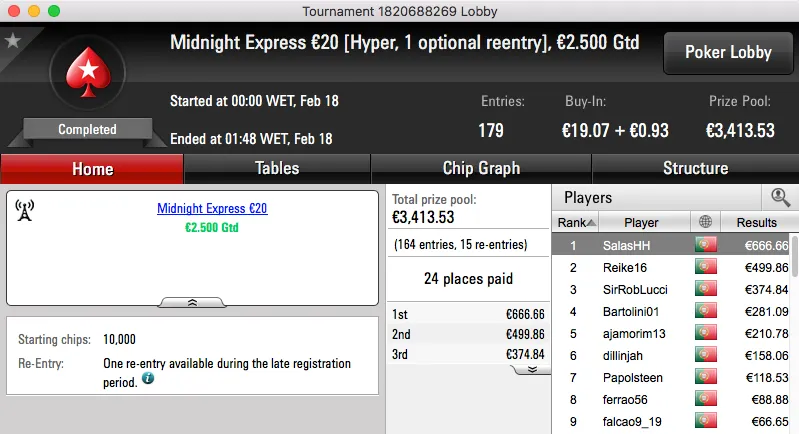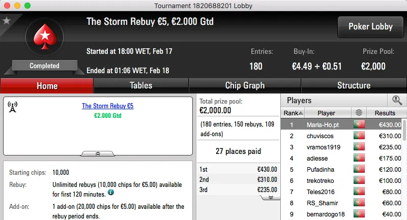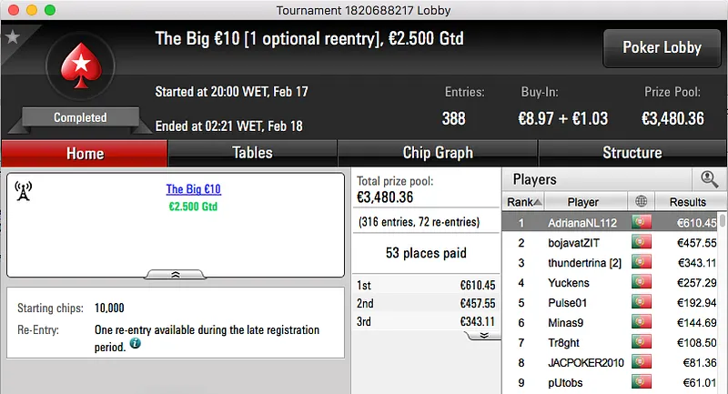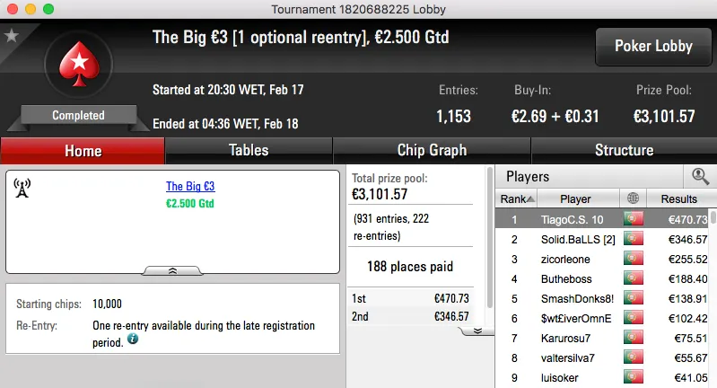 O pódio da mesma fecha com a vitória de TonyMichel76 no The Big €100. A vitória sobre RataMagica (€1,063) no heads-up valeu-lhe um prémio de €1,384.