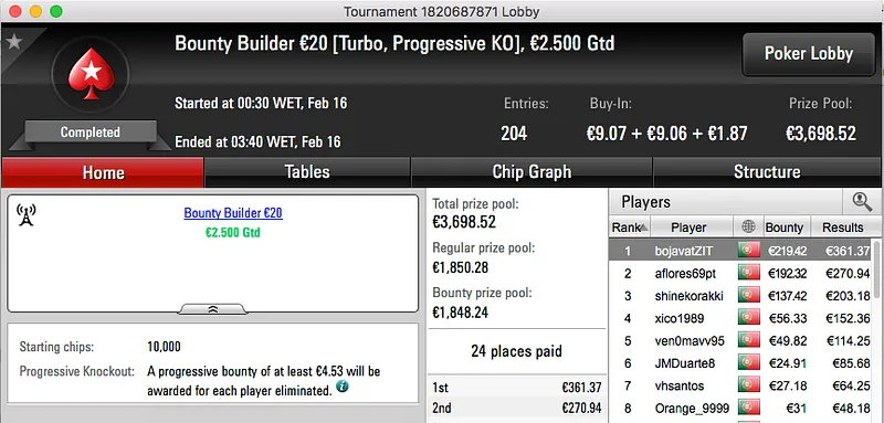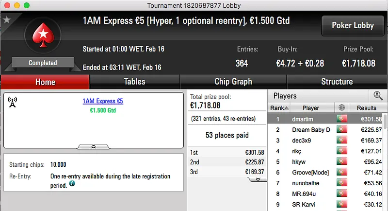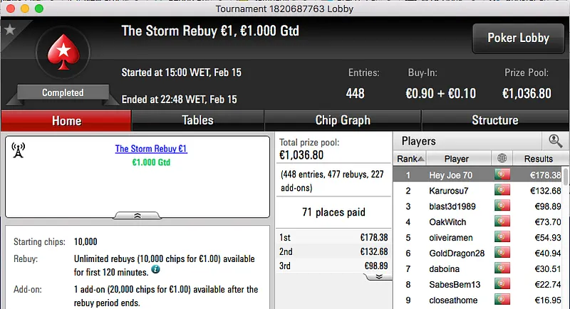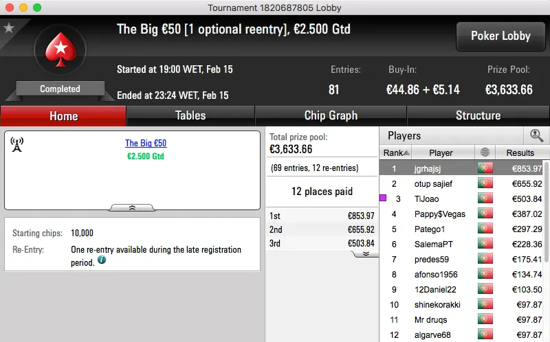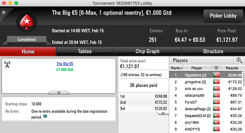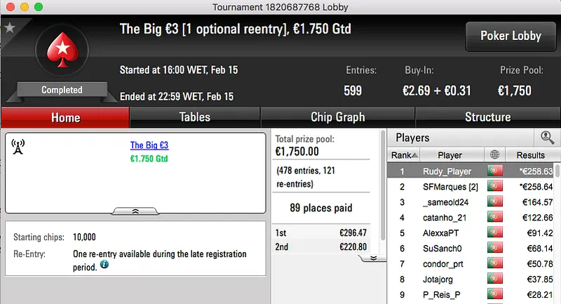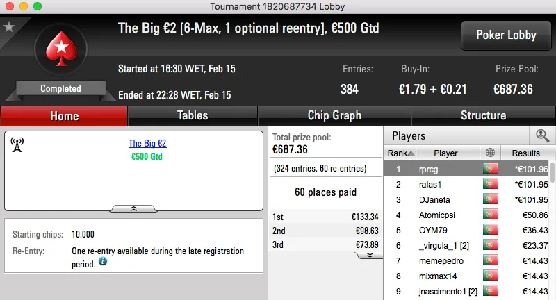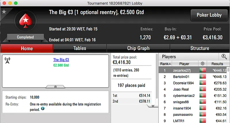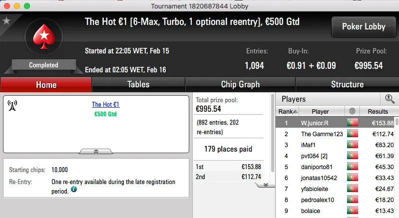 O resto do pódio de hoje fica entregue aos 4 jogadores que chegara a acordo na mesa final do The Big €100. Papolsteen, tribetes10, zarabatana e spartan the receberam €1,302.