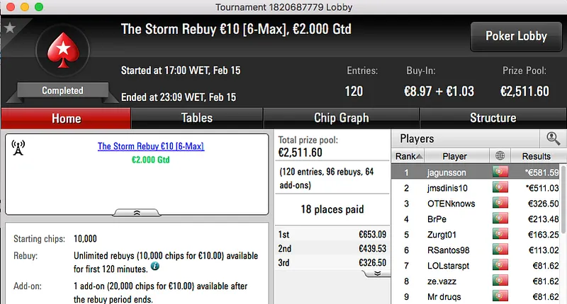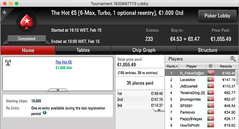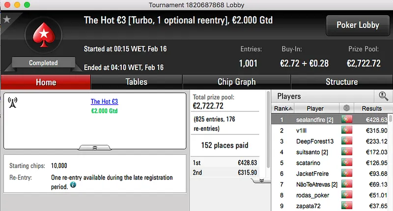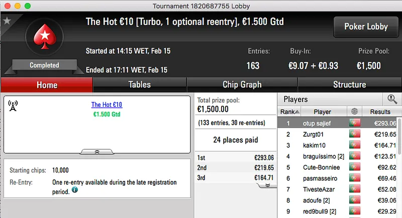 A sessão de quarta-feira da PokerStars.pt fica marcada pelas duas vitórias alcançadas por shinekorakki. A maior, e que aconteceu primeiro, foi no The Hot BigStack Turbo €50. A vitória no heads-up contra RataMagica (€1,095) rendeu €1,588. Minutos depois vencia também o The Big €10 e juntava mais €736,48 à sua banca.