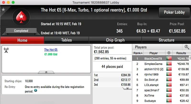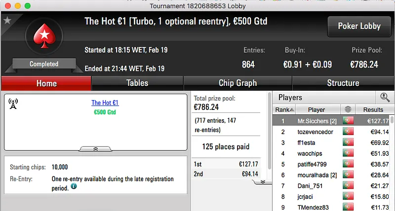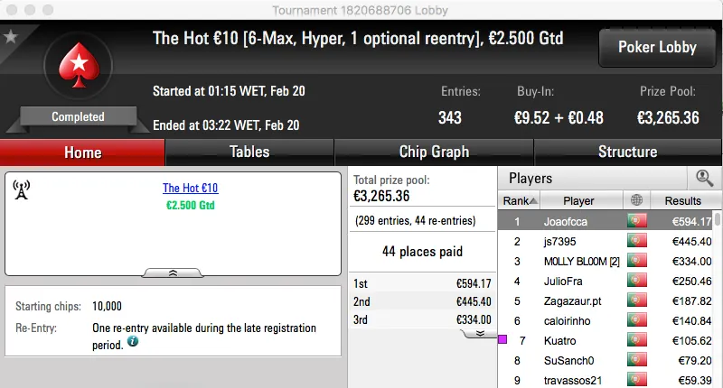 O The Hot BigStack Turbo €50 continua a distribuir bons prémios mesmo com a concorrência dos torneios de domingo e ontem entregou o 2º e 3º lugares do pódio. tiago_pt93 (€1,866) e LittleMajor1 (€1,841) chegaram a acordo heads-up.