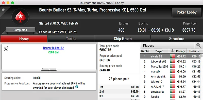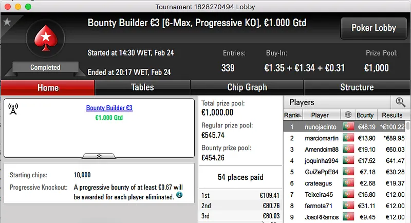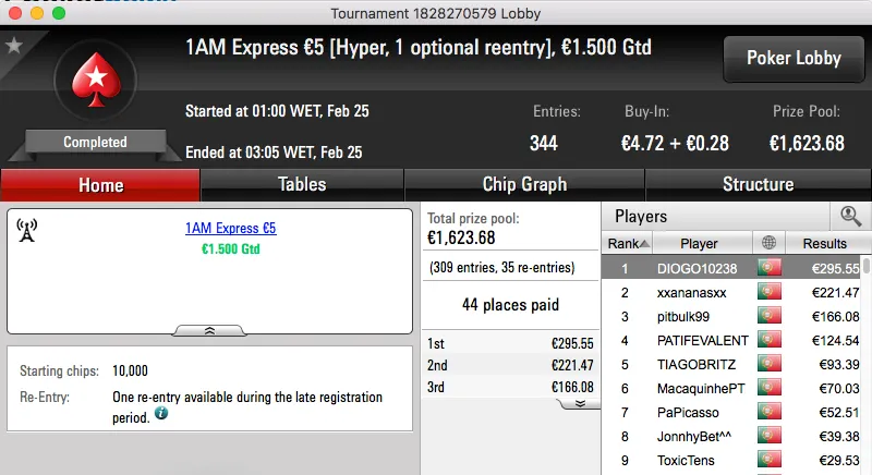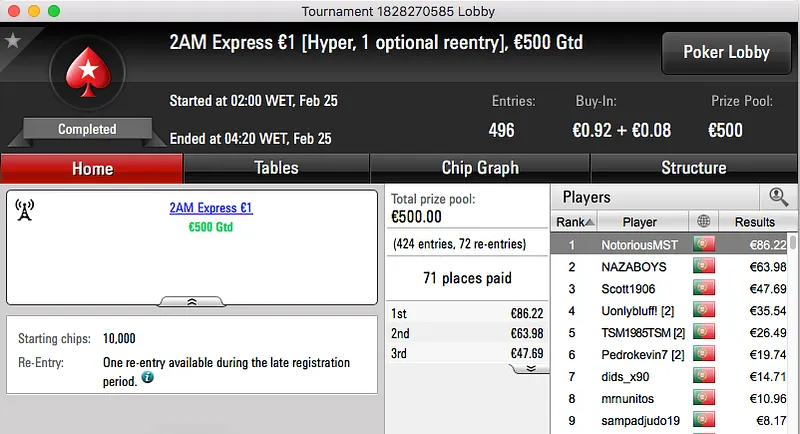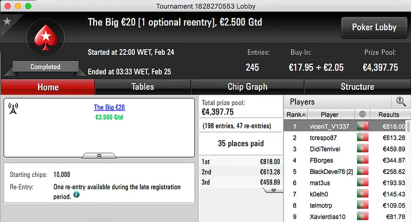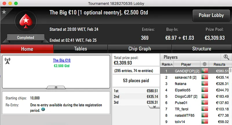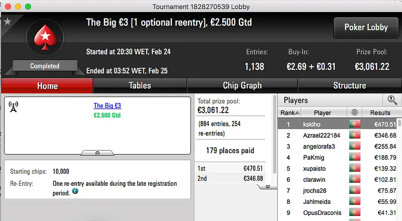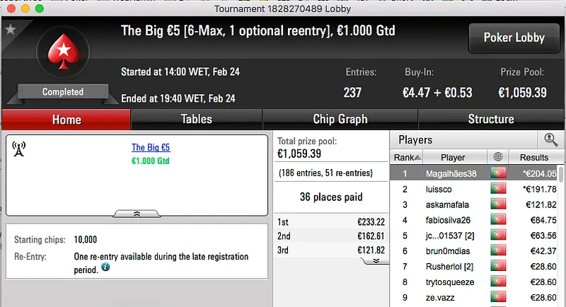 A sessão de sexta-feira da PokerStars.pt fechou com um velho conhecido da comunidade a vencer o The Big €100. Tomé Moreira bateu whitequality no heads-up e ficou com os €1,193 reservados ao vencedor.