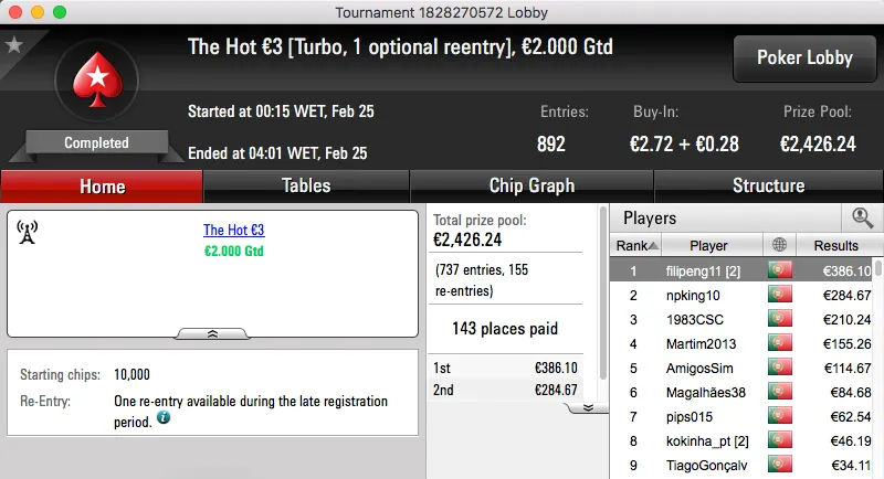 O restante pódio ficou preenchido com TabordaPT (€1,129) e famaguda01 (€1,045), fizeram acordo no heads-up do The Hot BigStack Turbo €50.