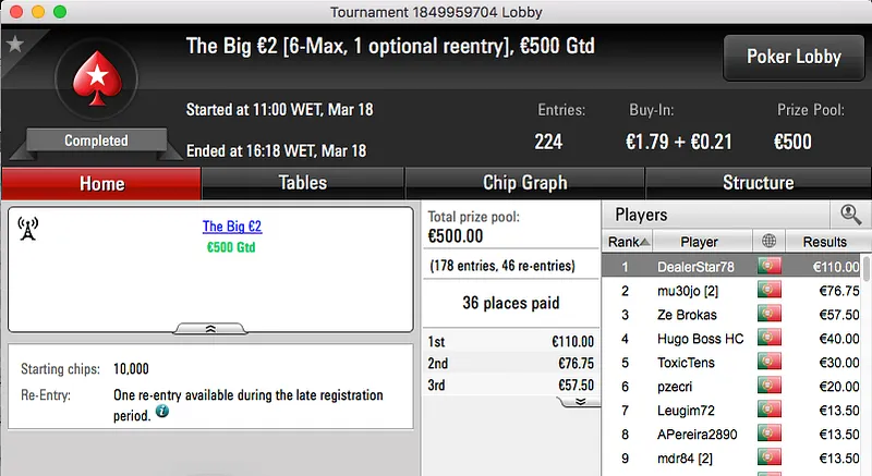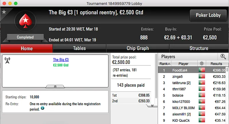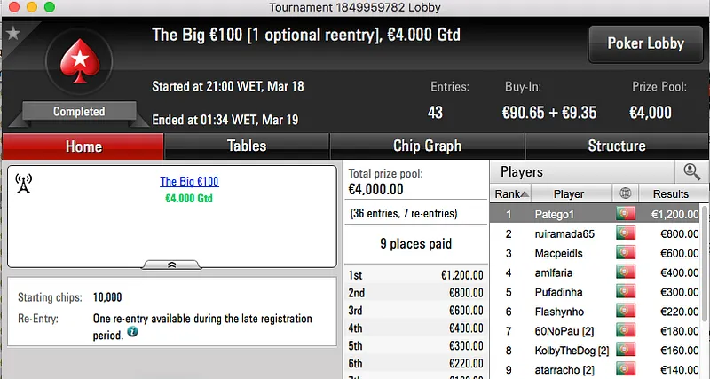 O segundo lugar do pódio foi alcançado pelo vencedor do The Big €100, Patego1 ganhou no heads-up a ruiramada65 (€800) e adicionou €1,200 à sua conta.