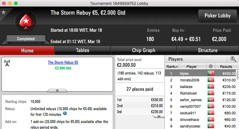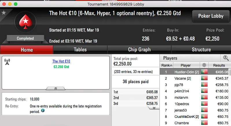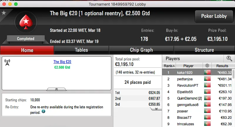 A sessão de sábado assistiu a mais um triunfo de amlfaria na PokerStars.pt, desta vez no The Hot BigStack Turbo €50. Depois de bater TabordaPT (€875) no heads-up, amlfaria ficou com mais €1,300 na sua banca.
