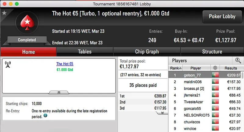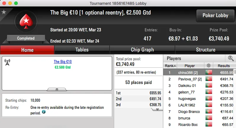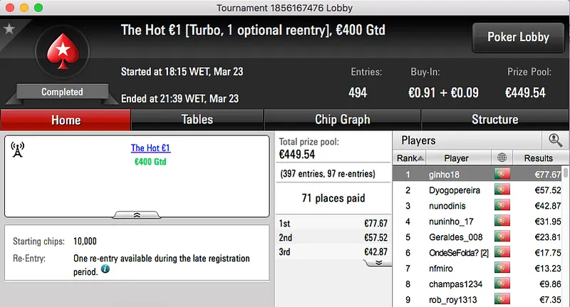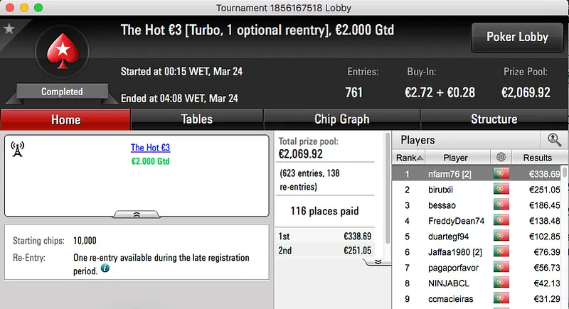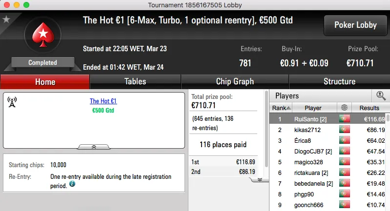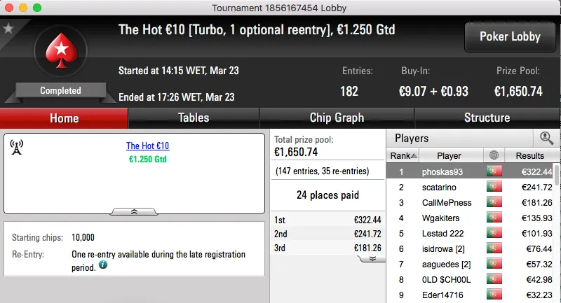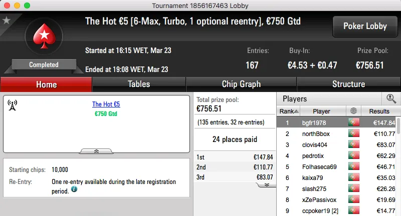 O The Hot BigStack Turbo €50 voltou a entregar o maior prémio da sessão e bakerpt acabou por juntar €1,426 à sua conta da PokerStars.pt. A vitória foi obtida às custas de j0nhf6 (€959), no pódio ficou ainda viceLitras (€713).