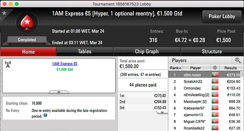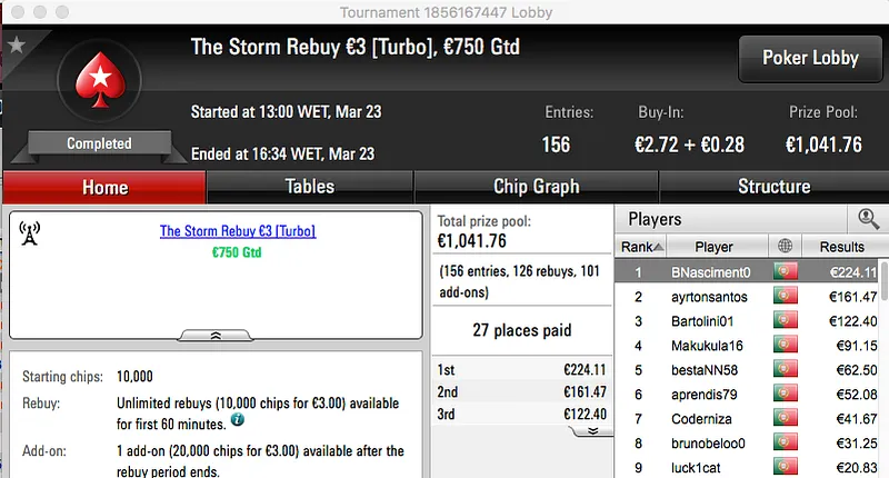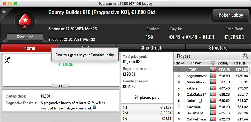 Por último, o pódio da sessão encerra com a vitória de Jorge "jokacross" Cardoso no Bounty Builder €30 (€877).