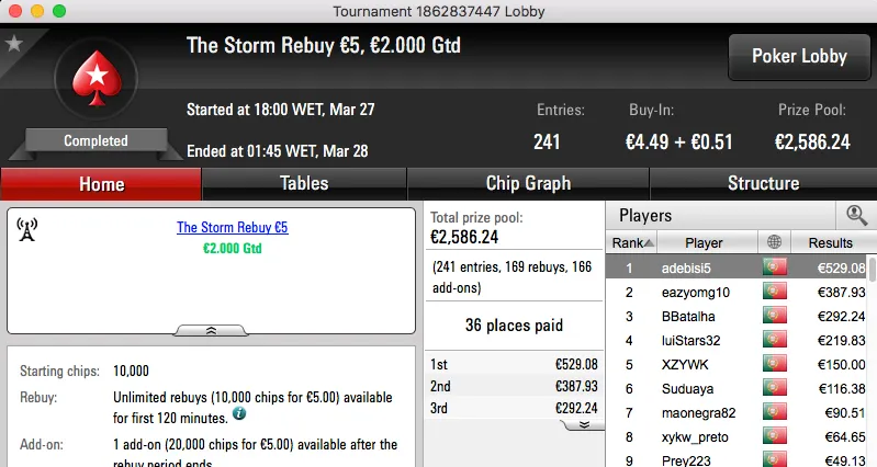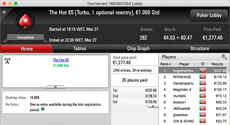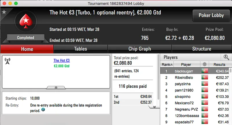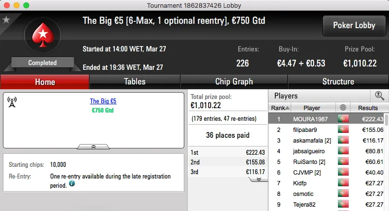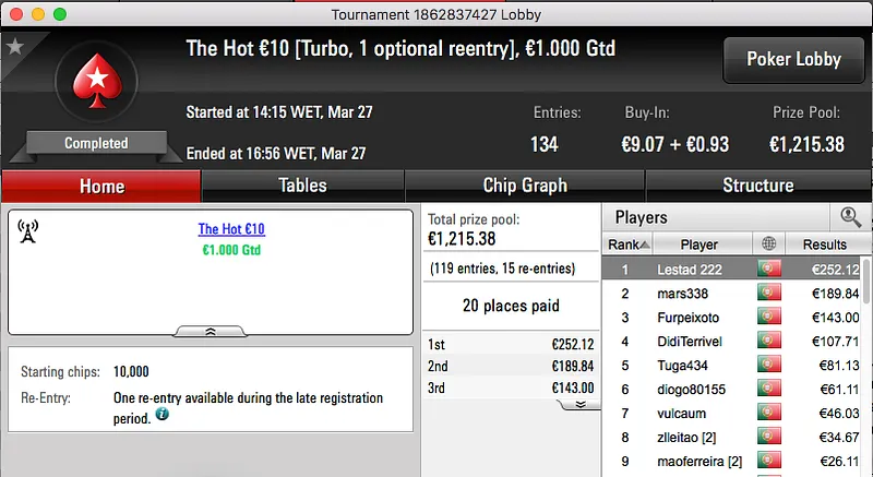 Por último, o bronze fica para o homem que supostamente não faz raise, just flat!! El Flatador foi o melhor no The Big €20 e tem agora mais €844 na sua conta da PokerStars.