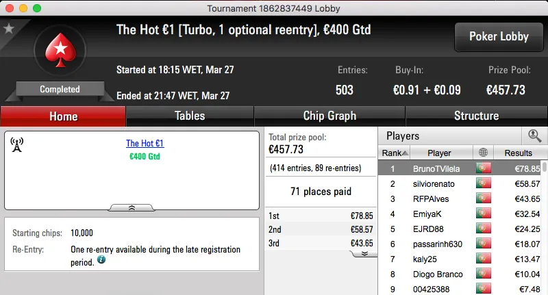 O The Hot BigStack Turbo €50 voltou a ser o torneio que mais pagou e Neves ficou com mais €1,762 na sua conta depois de bater slbenfica313 (€1,215) no heads-up.