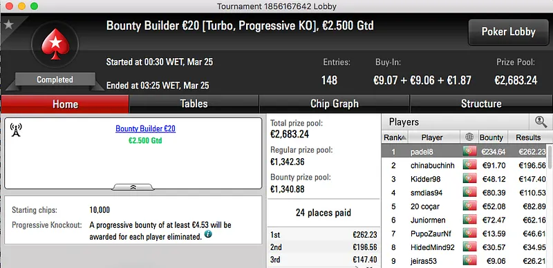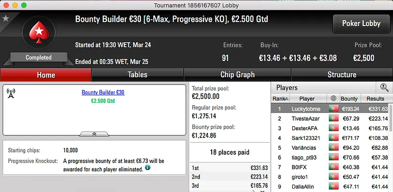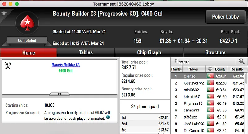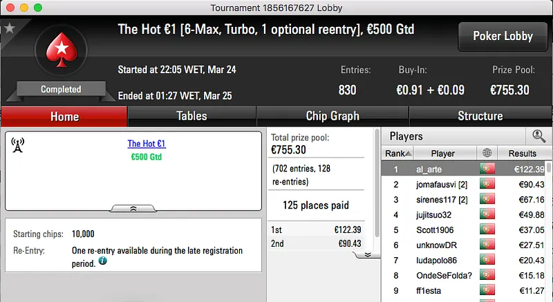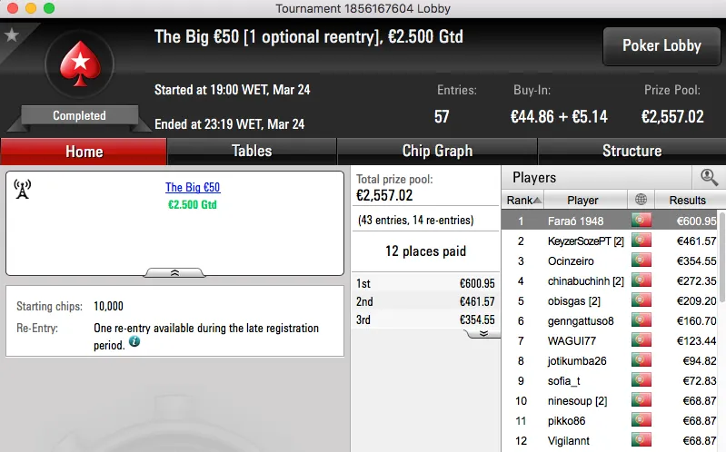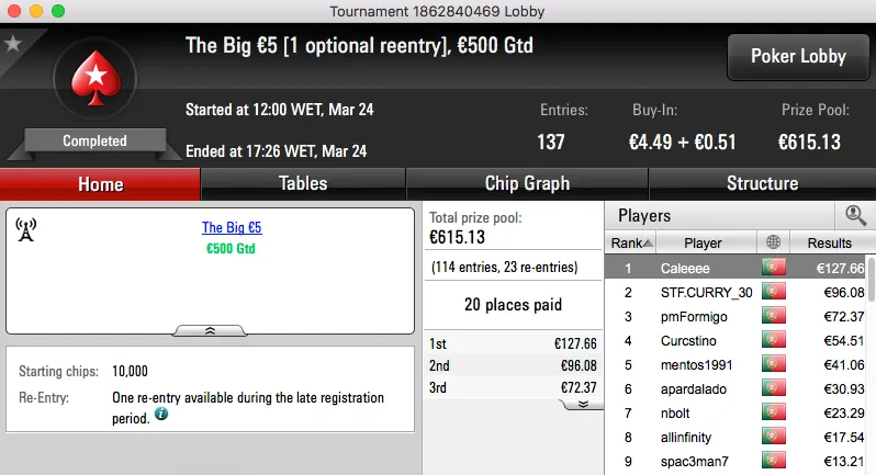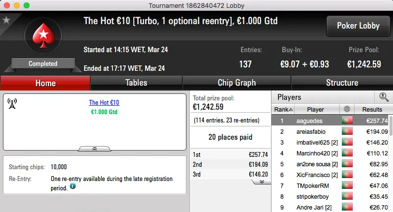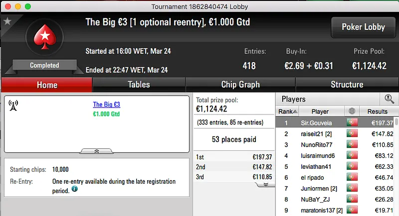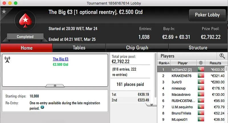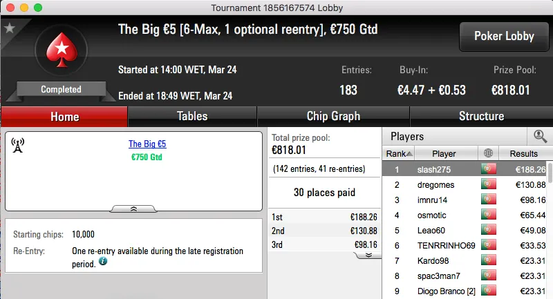 Por último, Kidder98 levou a melhor sobre Peixinho2016 (€554) no The Big €20 e ficou com os €739 reservados ao vencedor.