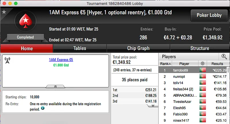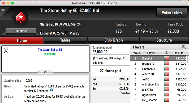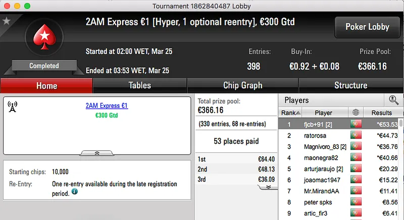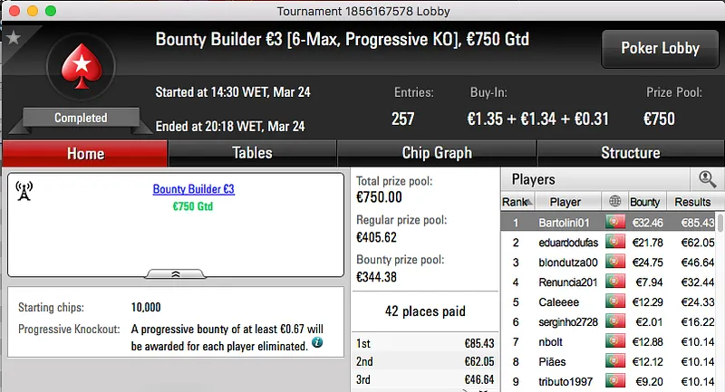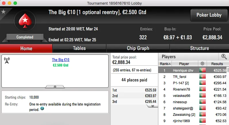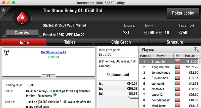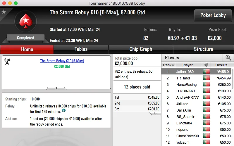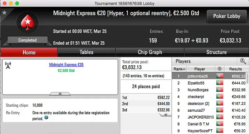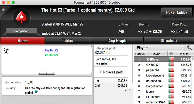 Por último, Kidder98 levou a melhor sobre Peixinho2016 (€554) no The Big €20 e ficou com os €739 reservados ao vencedor.