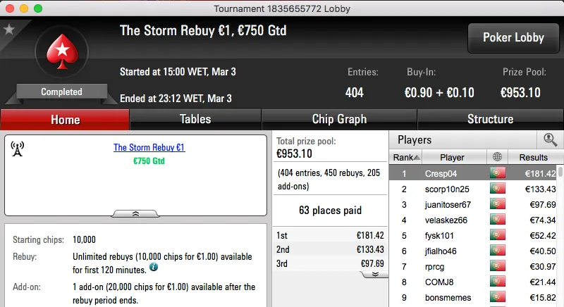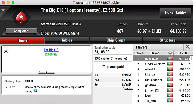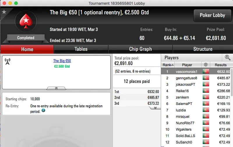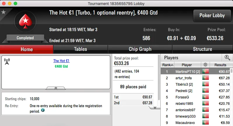 O restante pódio da sessão foi entregue no heads-up do The HotBigStack Turbo €50. SuSancho (€997) ficou em segundo lugar e a vitória, mais uma vez sem acordo, ficou com shinekorakki (€1,447).