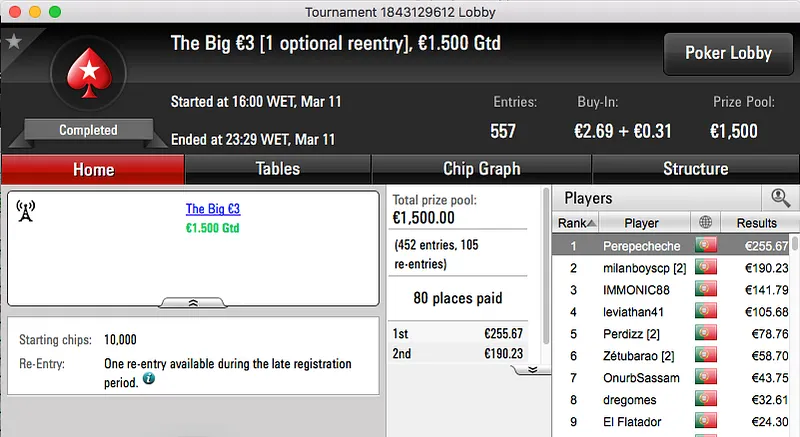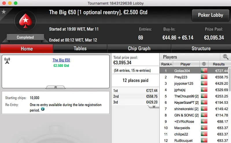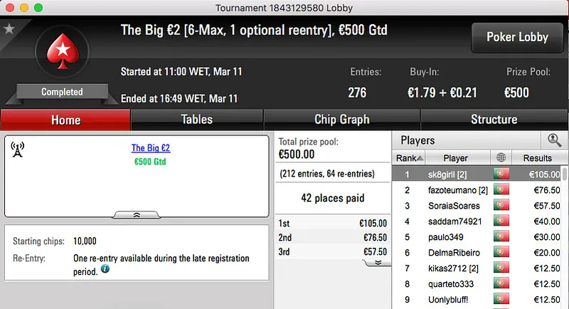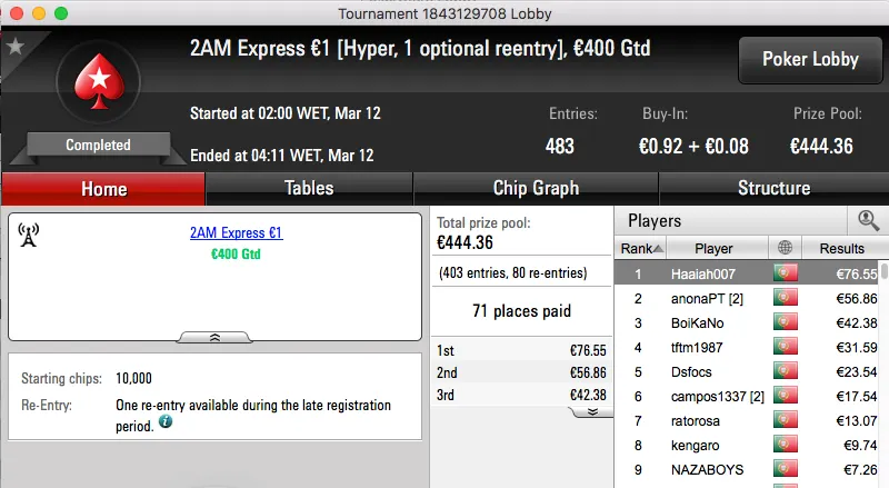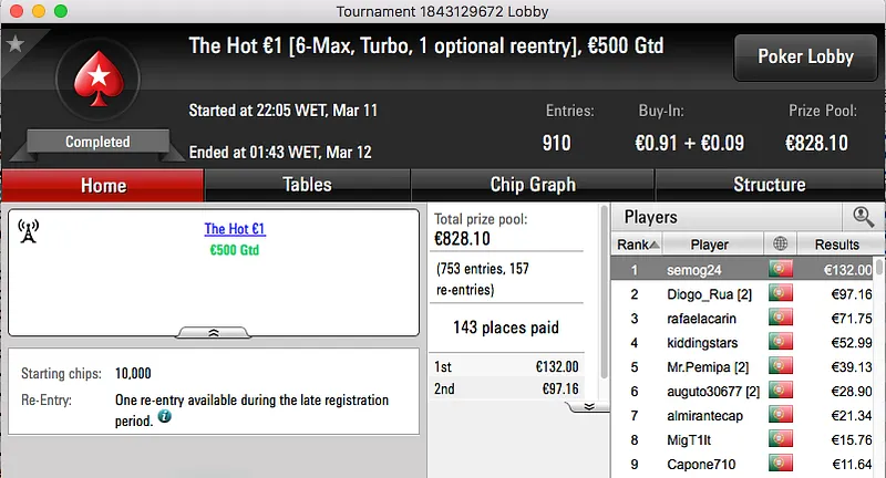 Ivanildo Gomes foi o maior vencedor da sessão de sábado da PokerStars.pt. O ex-Supernova Elite venceu o The Big €100 e recebeu €1,468 do prize pool de €4,895.