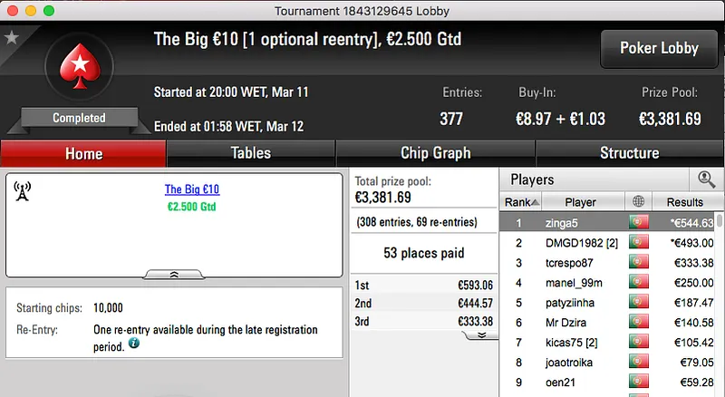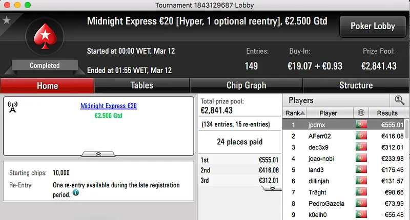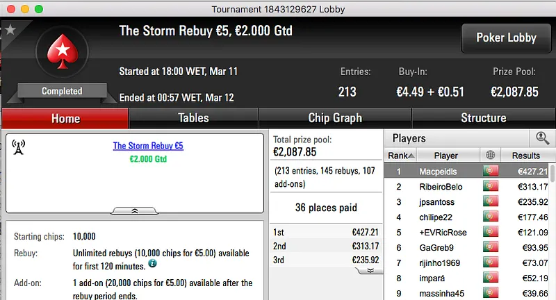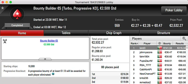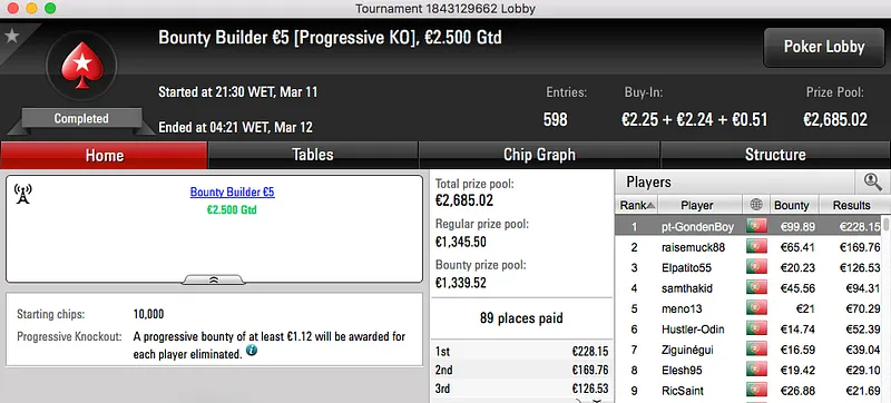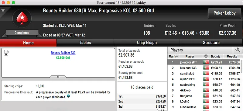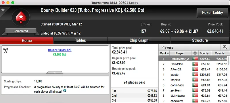 Por último, o pódio encerra com a vitória de jokacrossPT no Bounty Builder €30, entre prize pool e eliminações o prémio total ascendeu aos €857.