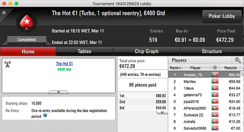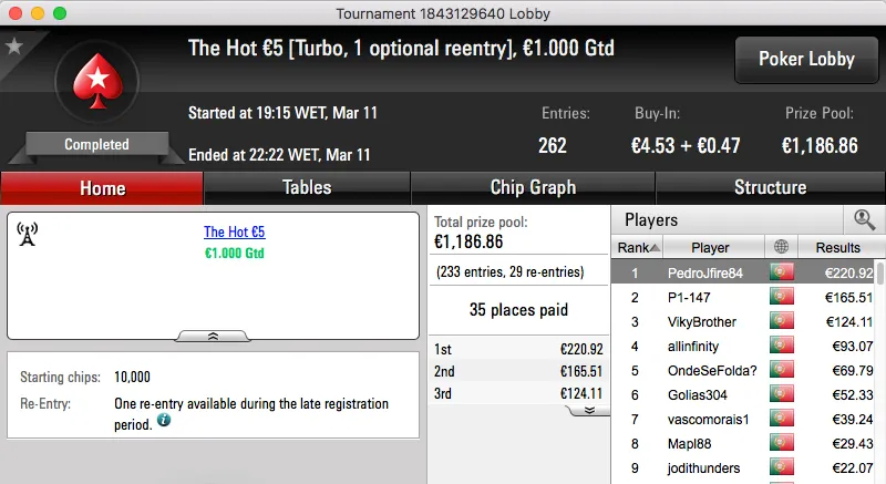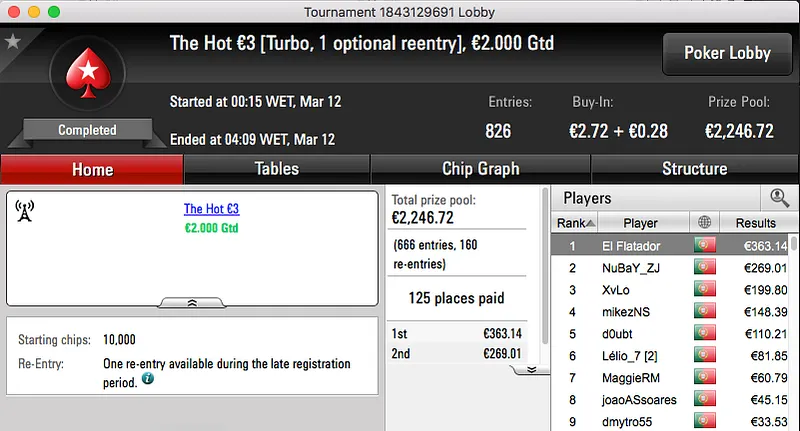 O segundo maior prémio atribuído foi para Braga, Tr8ght venceu o heads-up do The Hot BigStack Turbo €50 a rochagomes94 (€875) e recebeu €1,300.