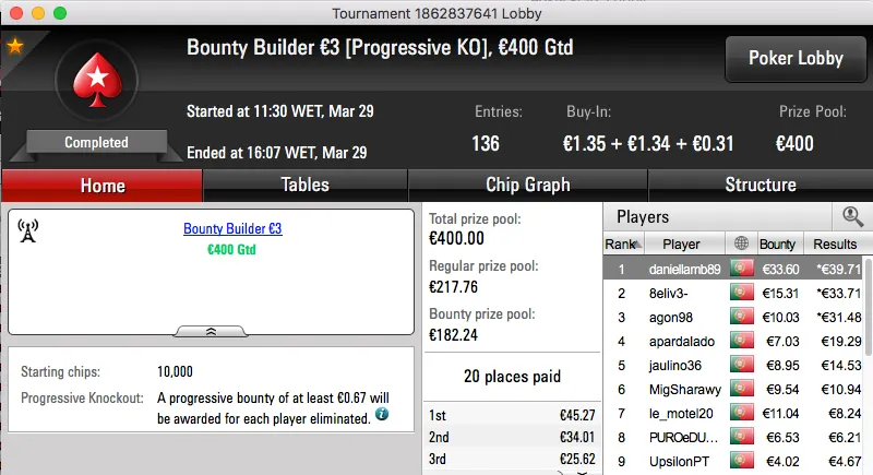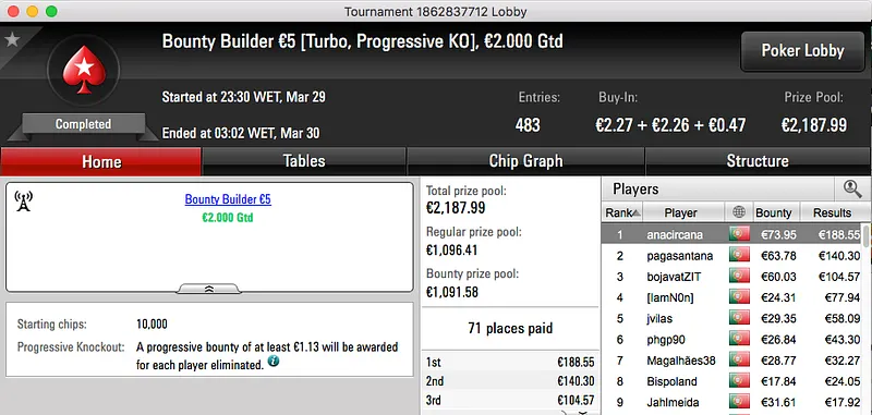 Eduardo "Diditerrível" Pinto fica com a prata da sessão, bateu SuSancho (€488) no heads-up do Bounty Builder €30 e entre prize pool e bounties somou €1,096.