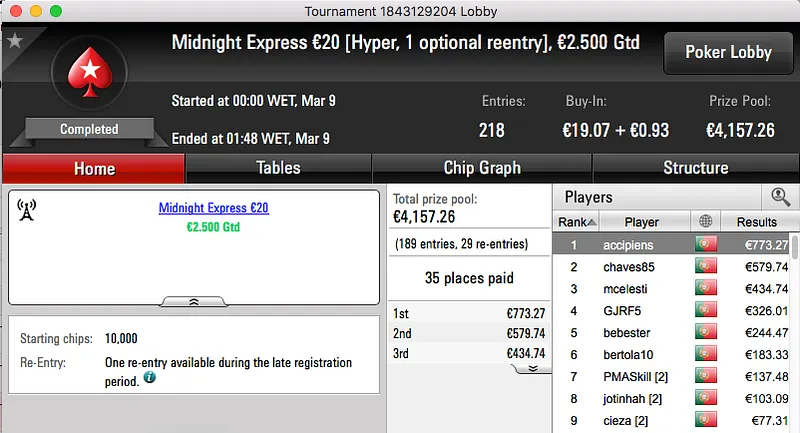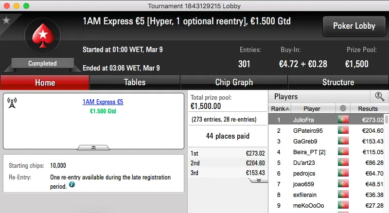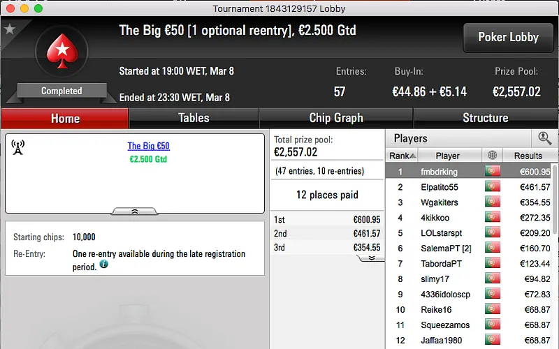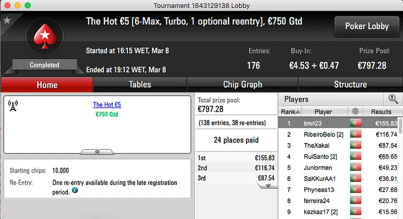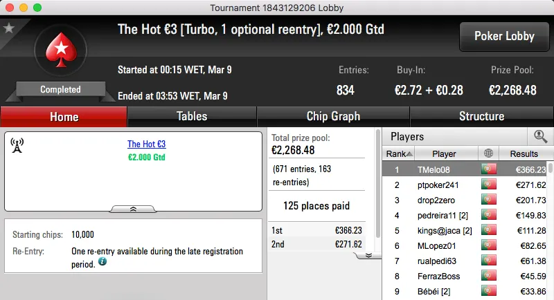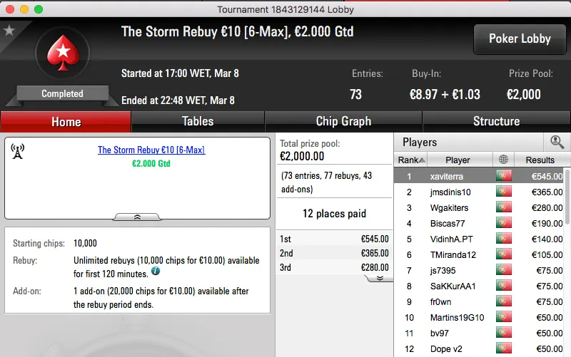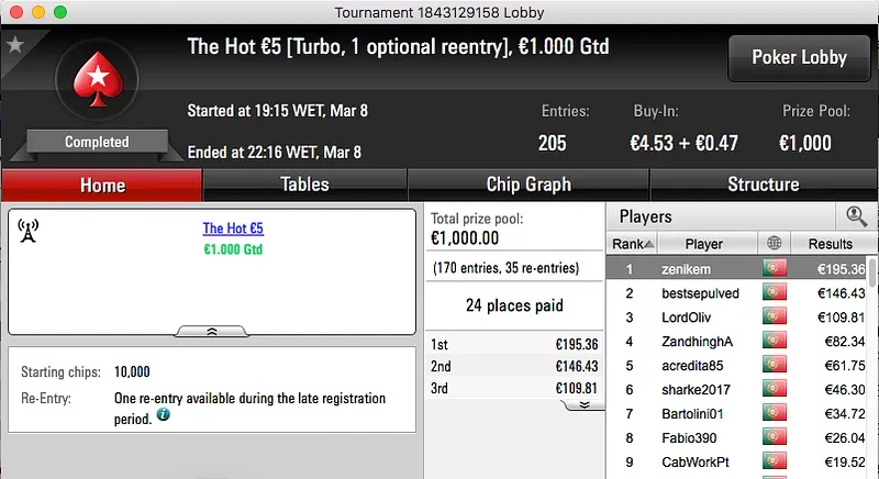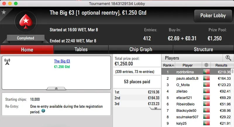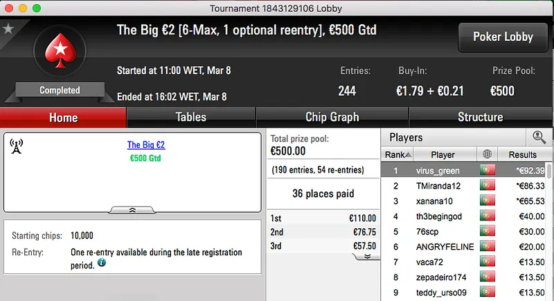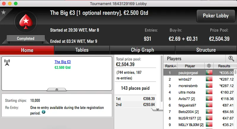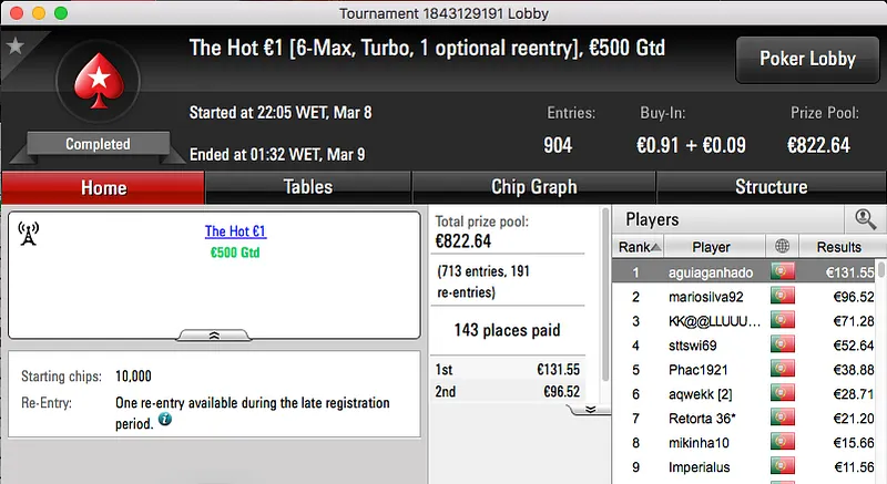 paulo349 foi o maior vencedor da sessão de quinta-feira da PokerStars.pt. A vitória sobre FenixRosa (€952) no heads-up do The Hot BigStack Turbo €50 e recebeu €1,381.