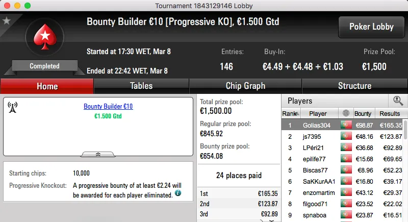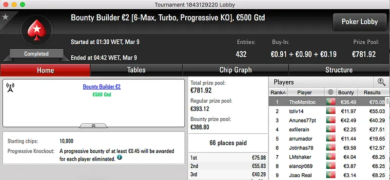 O pódio fecha com o vencedor do Bounty Builder €30, whitequality (€905) bateu broins75 (€352) em heads-up.