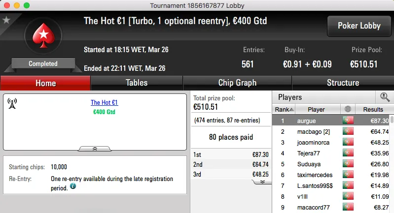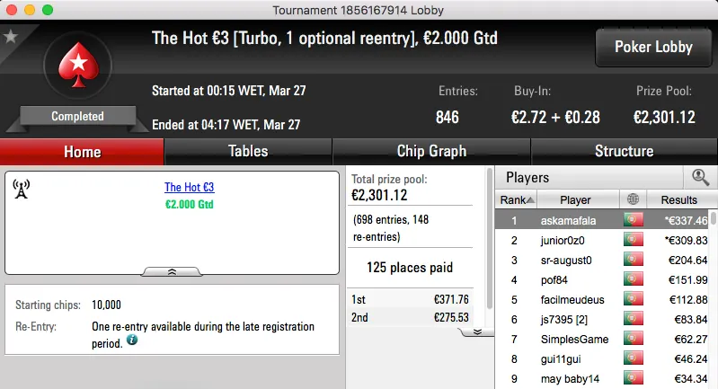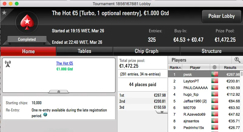 A vitória no The Hot BigStack Turbo €50 rendeu €2,194 e foi alcançada depois de bater mpcnogPS.PT (€1,530) em heads-up.