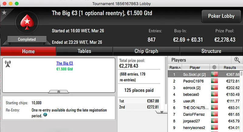 Por último, o bronze fica para Peixinho2016, venceu o Sunday Battle €30 e acordou com mais €1,581 na conta.