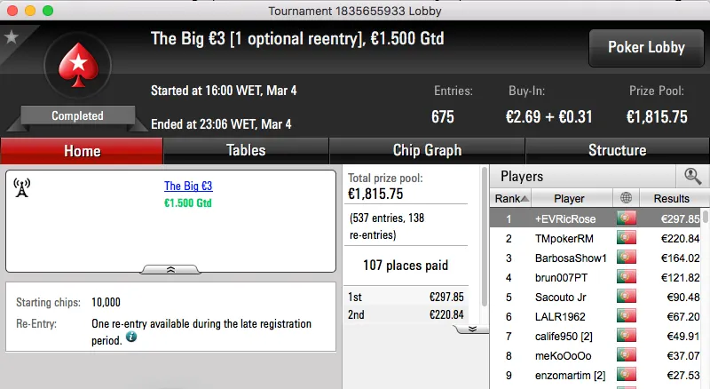 O restante pódio fica preenchido com os dois finalistas do The Big €100. Após um acordo heads-up, famaguda01 e Ricardo "Zarabatana" Lopes receberam €1,087.